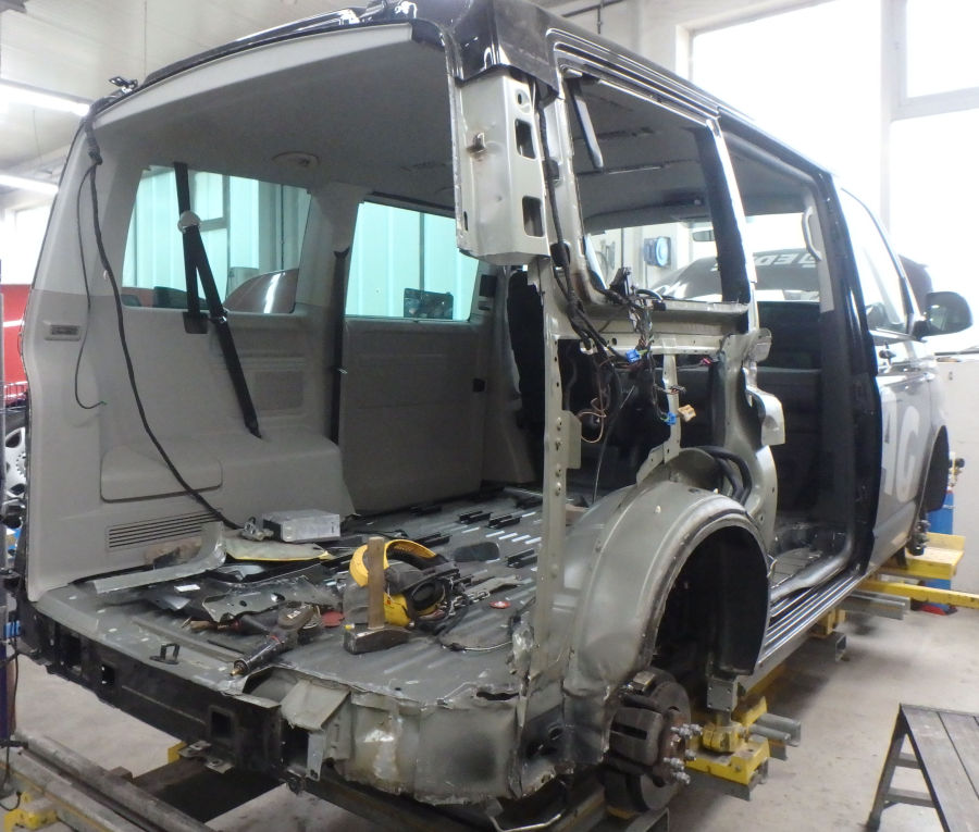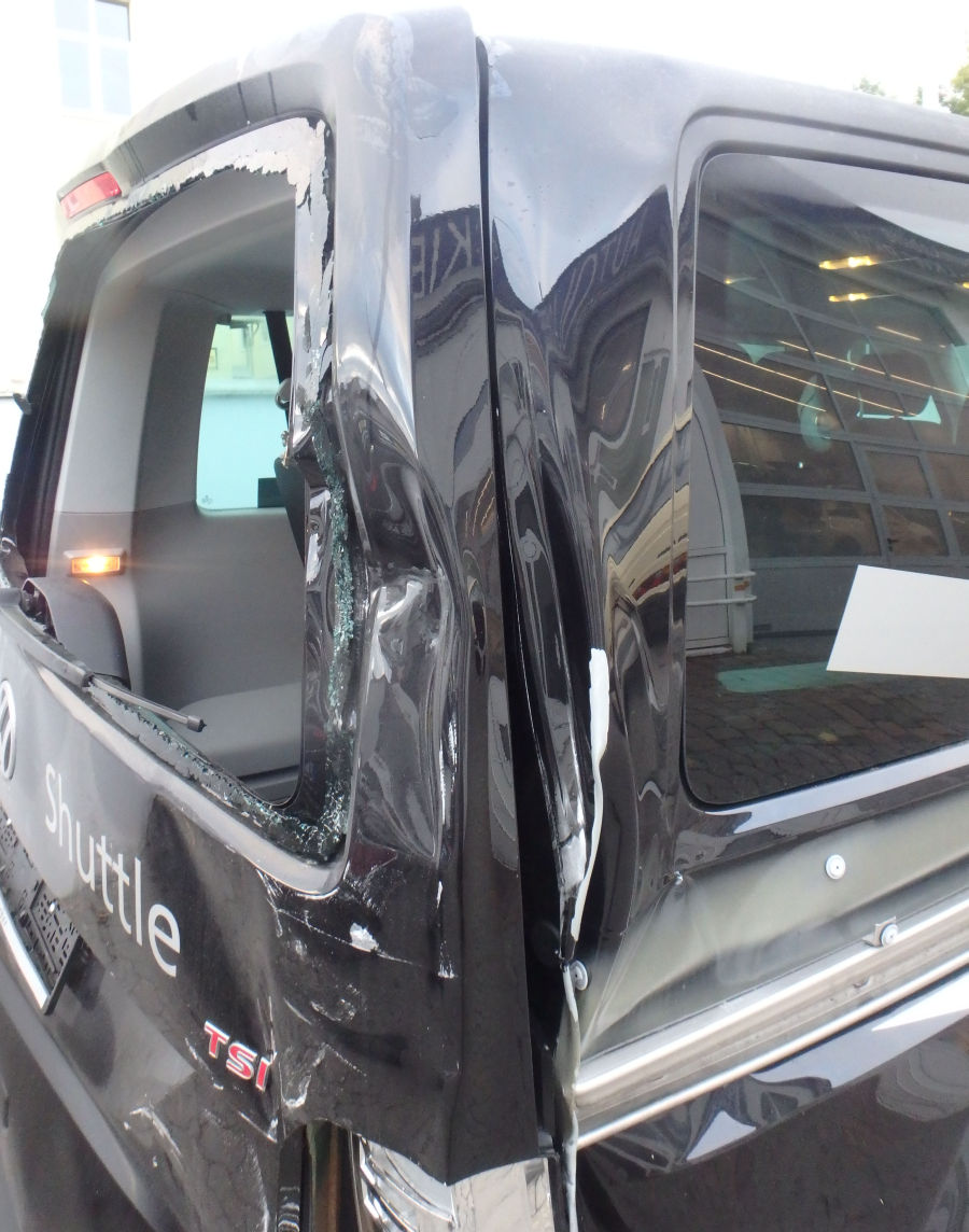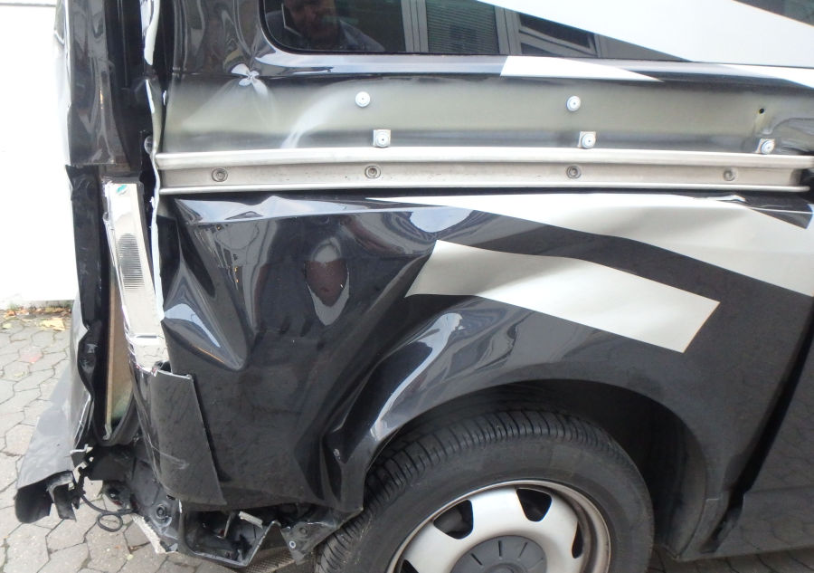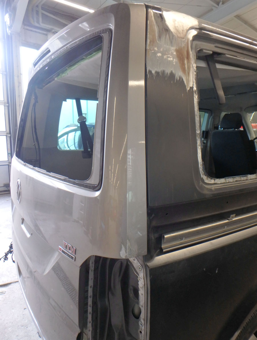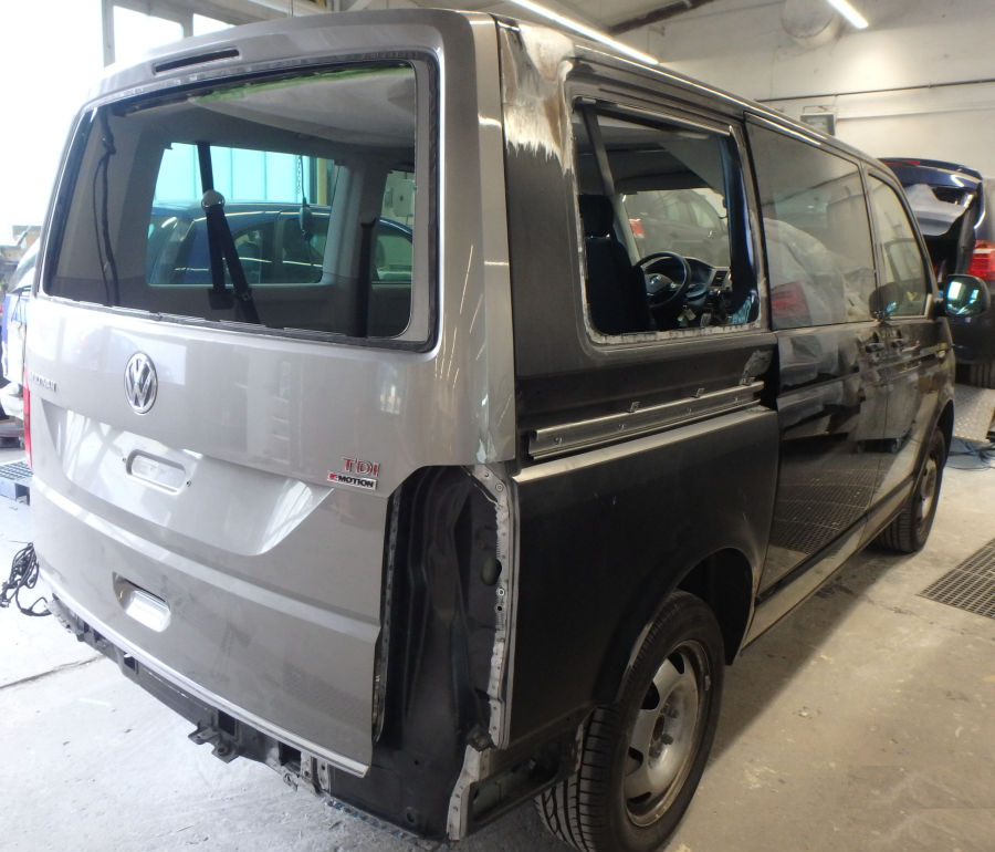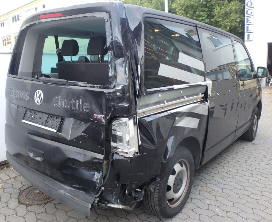 Der fast neue T6 hat einen Heckschaden hinten rechts, betroffen sind die hintere Seitenwand bis zur Schiebetür, die D-Säule hinten rechts, Stoßstange, Heckklappe, bis hin zur Innenverkleidung und