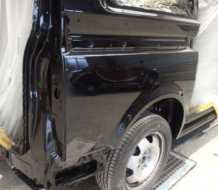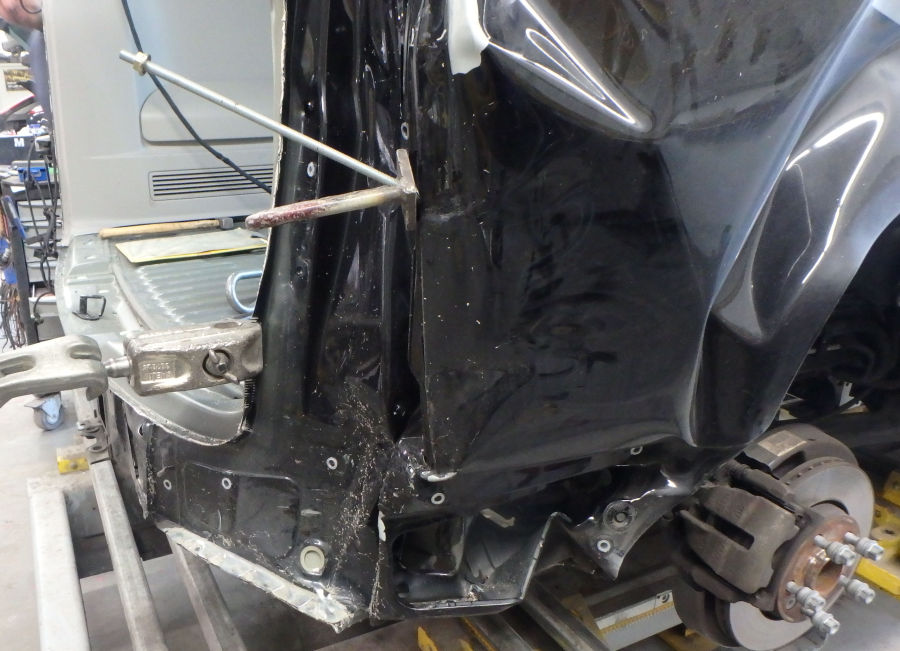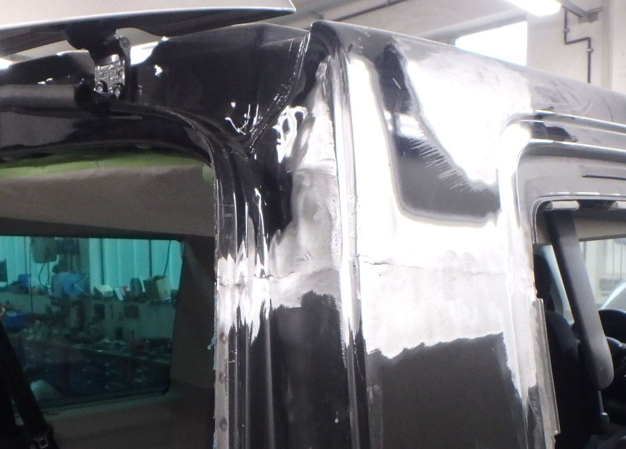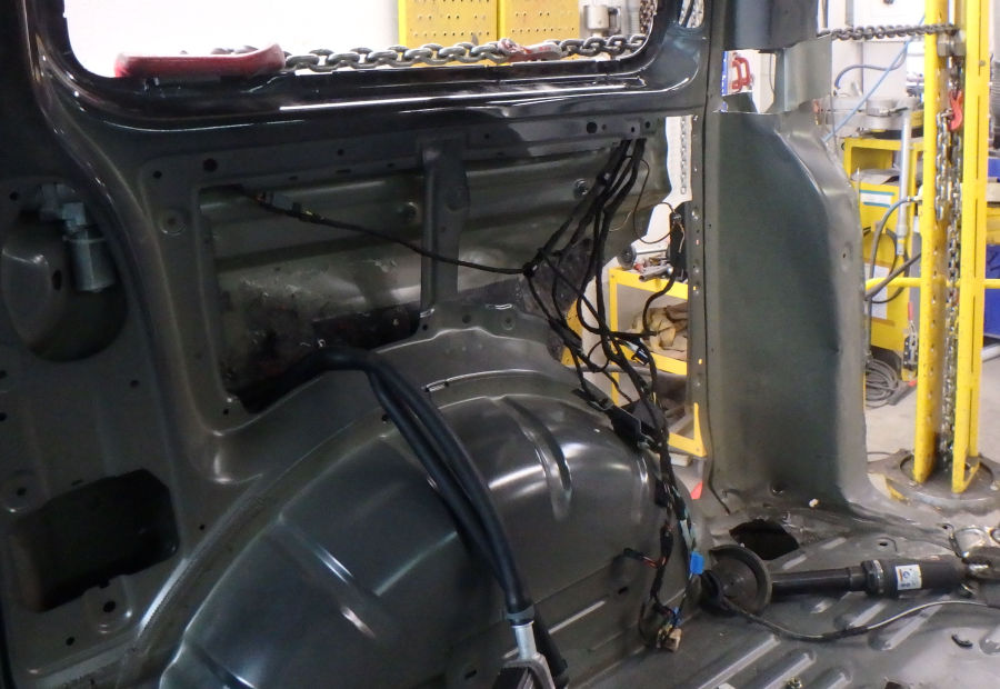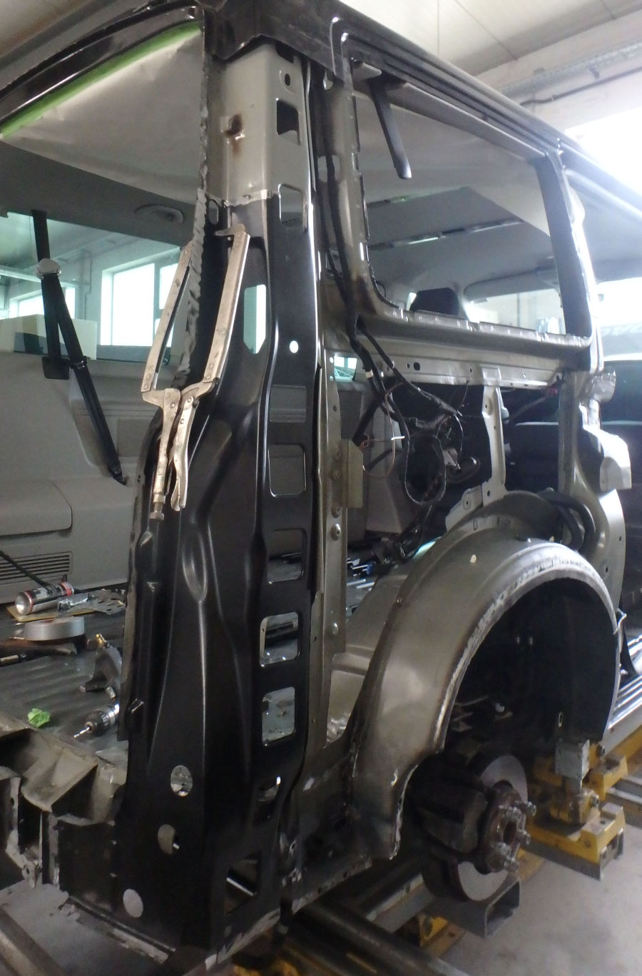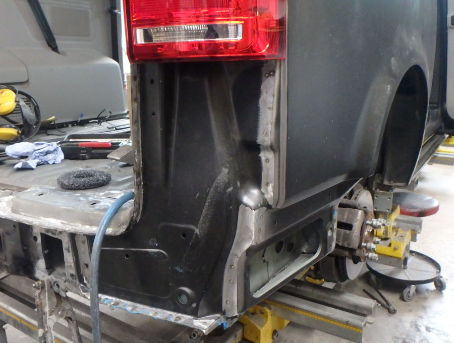 Schweißarbeiten an D-Säule und Seitenwand, Kontrolle der Passform auch anhand der neuen Rückleuchte: