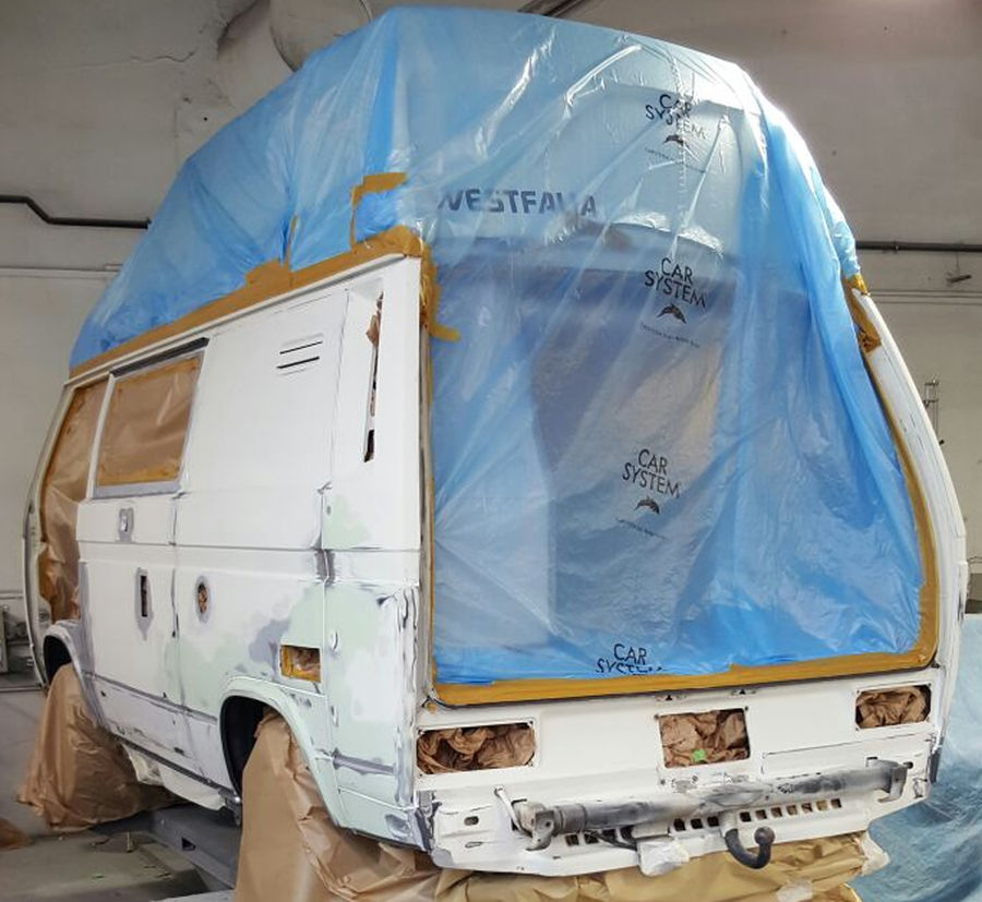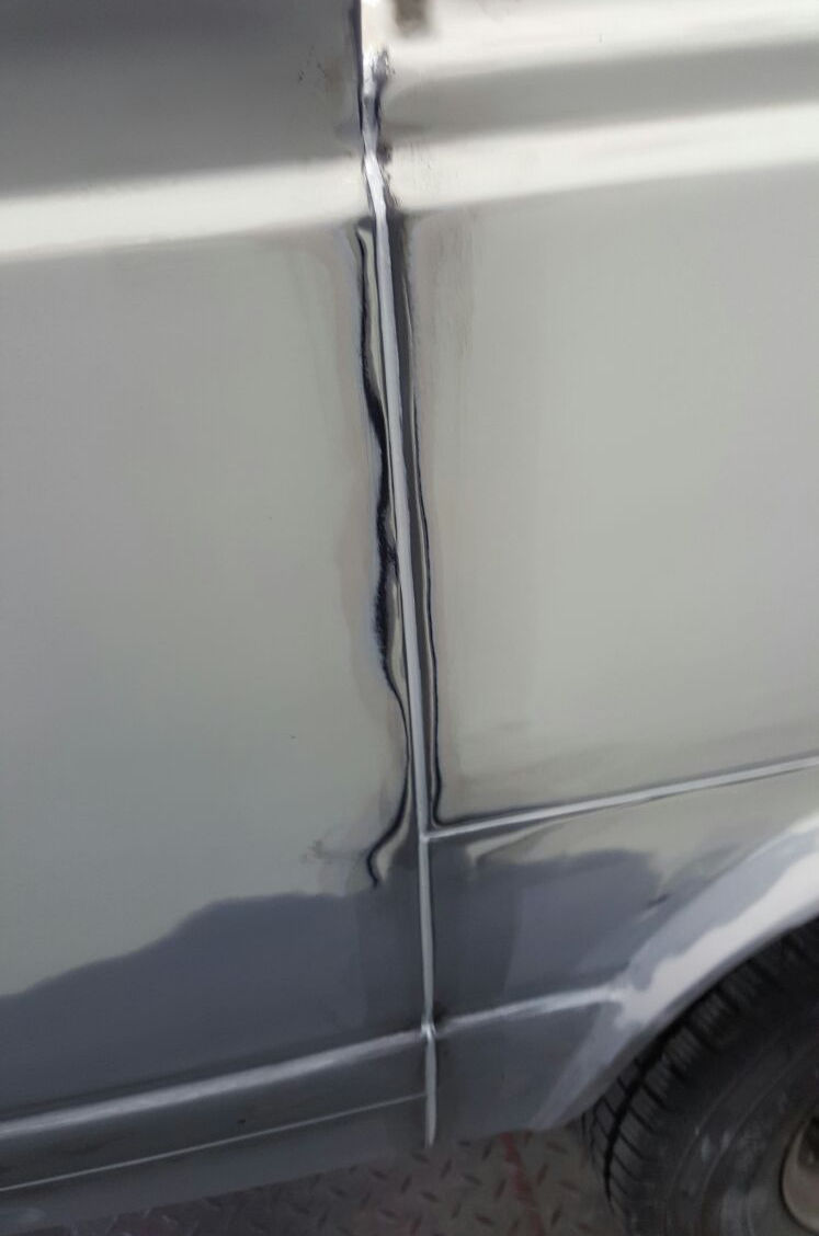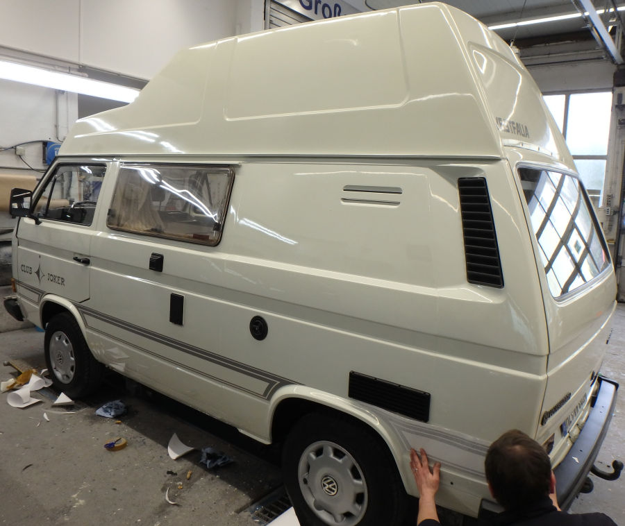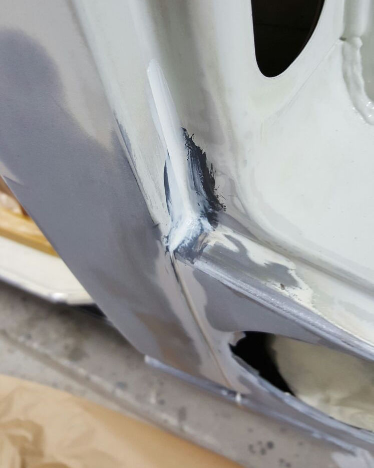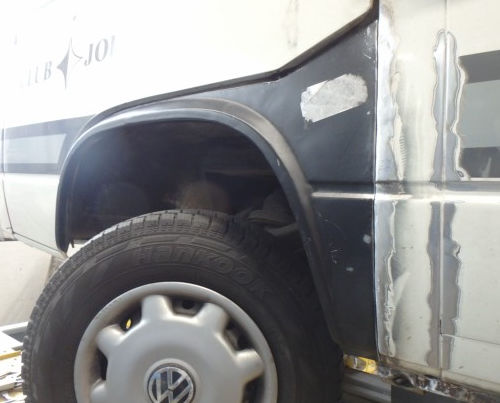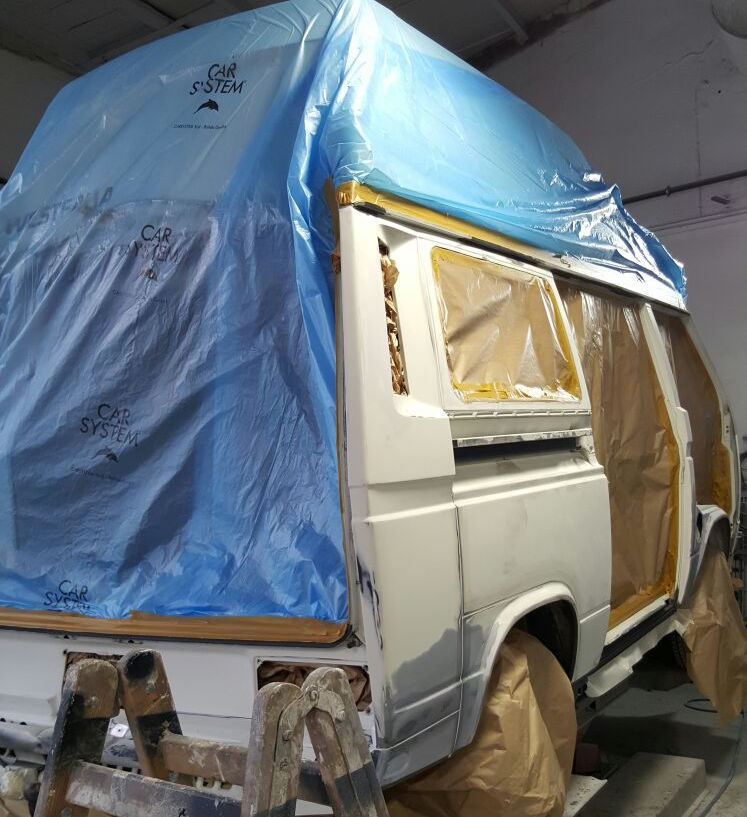 Spachteln, schleifen, Fugen elastisch abdichten und Fahrzeug abkleben.