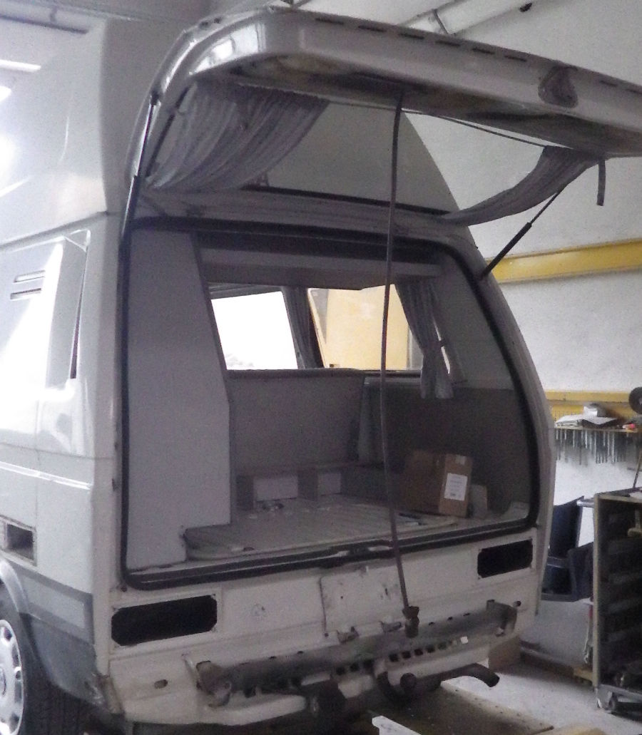 Ursprünglich ein geschlossener Kastenwagen, wurde er zu einem Camper mit Westfalia-Hochdach und Innenausstattung umgebaut.