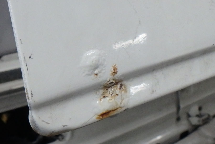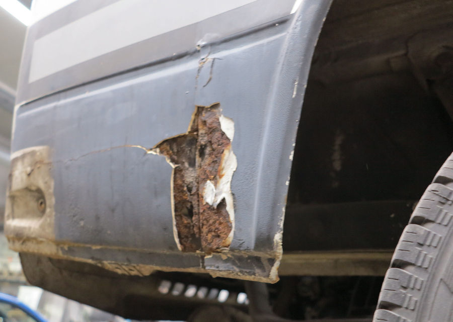 Rechte Fahrzeugseite: Rost unter Spachtelmasse am Heckabschlussblech.