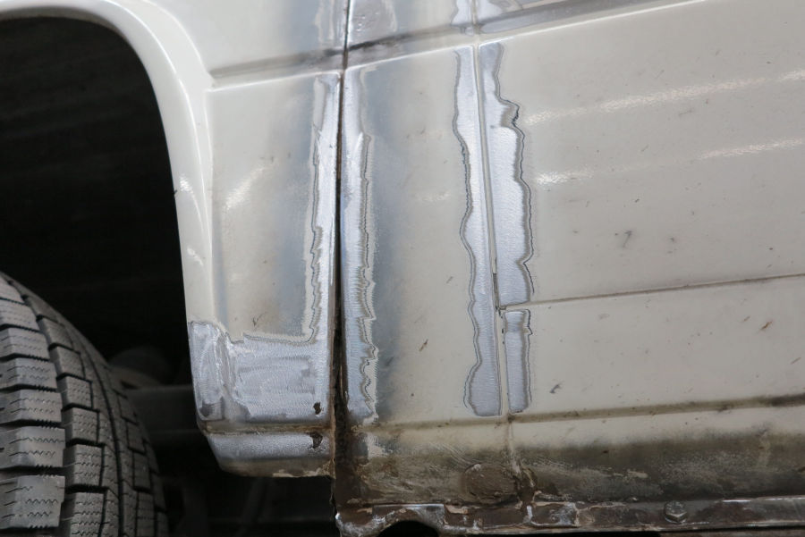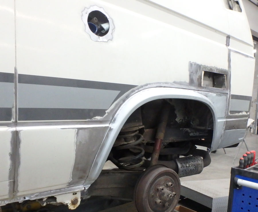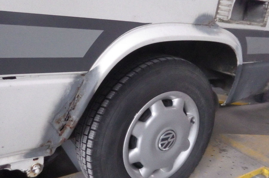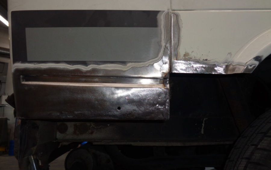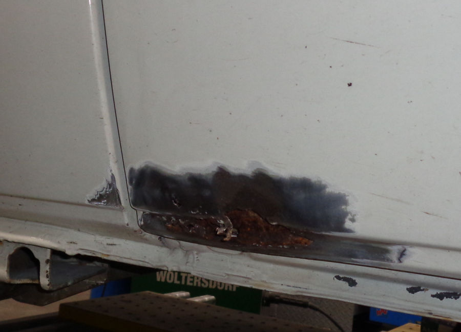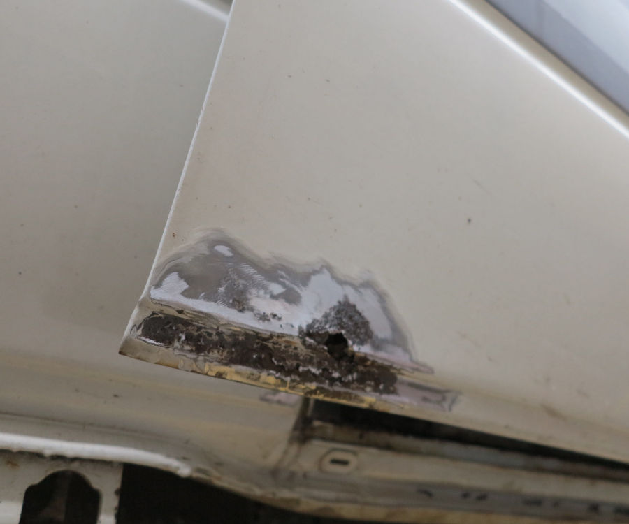 Linke Fahrzeugseite: Fugenrost hinter der Fahrertür / Radlauf vorne links herausgetrennt / Neuteil eingesetzt.