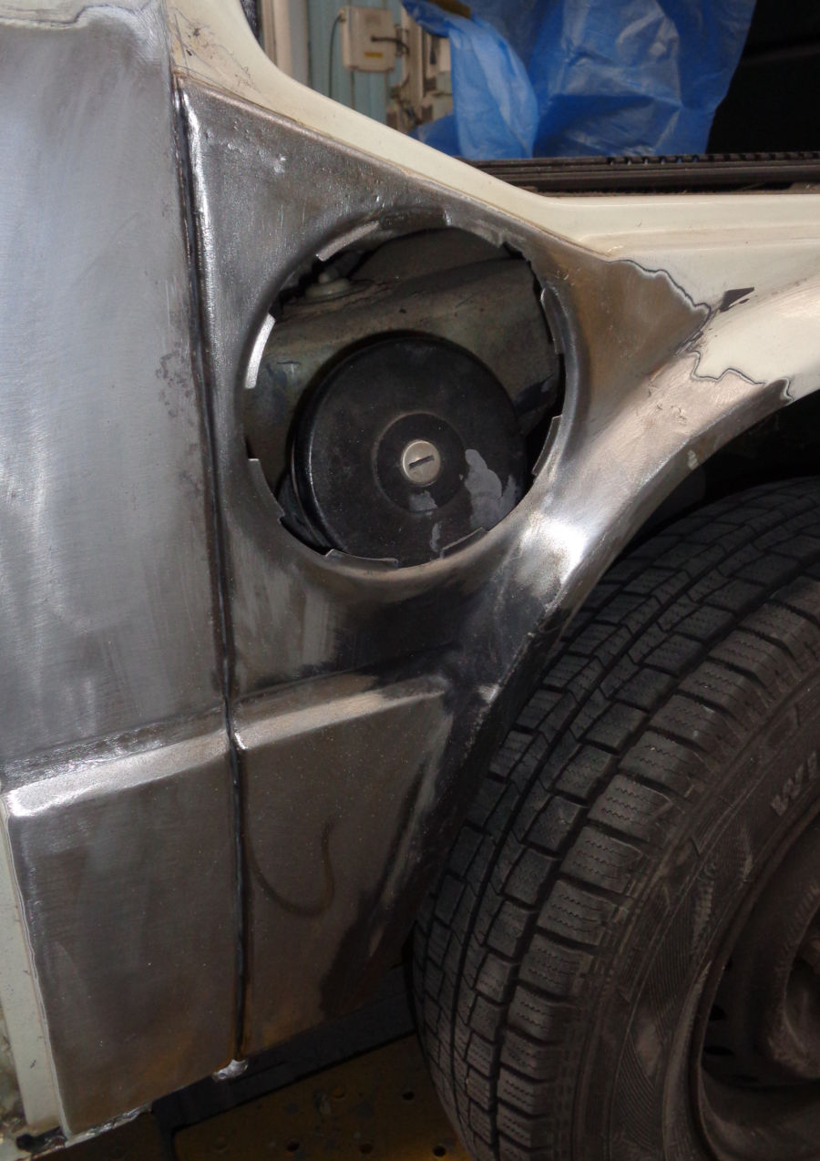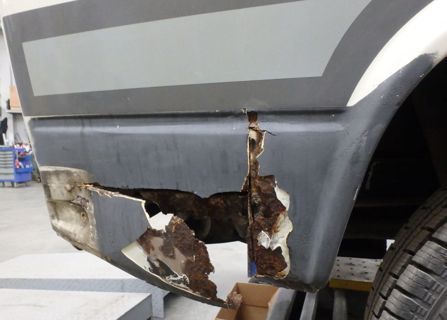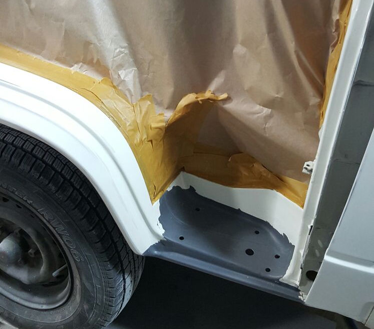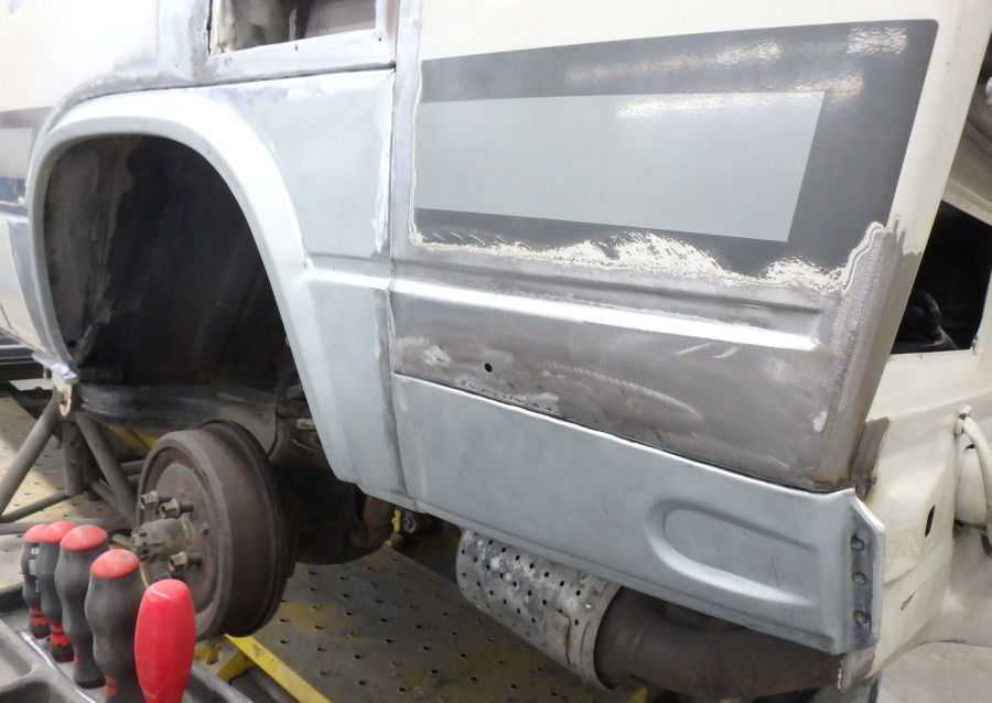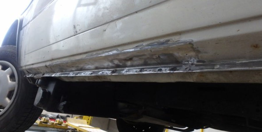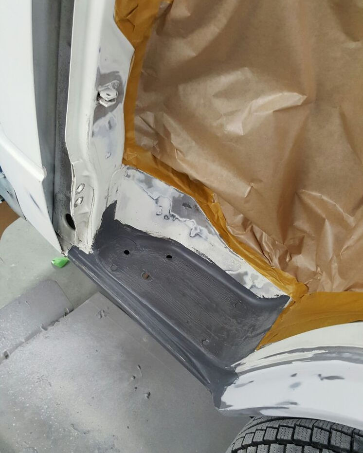 Linke Fahrzeugseite: Fugenrost hinter der Fahrertür / Radlauf vorne links herausgetrennt / Neuteil eingesetzt.