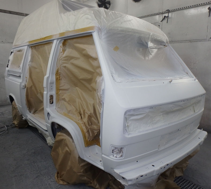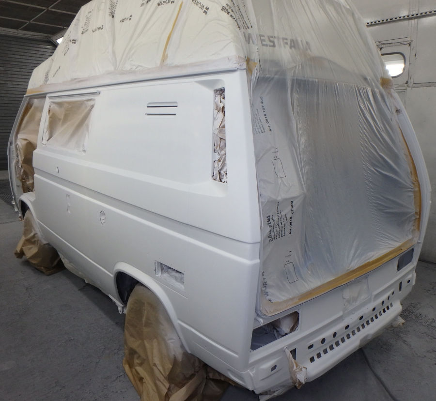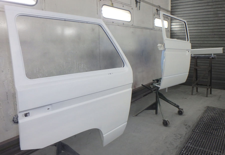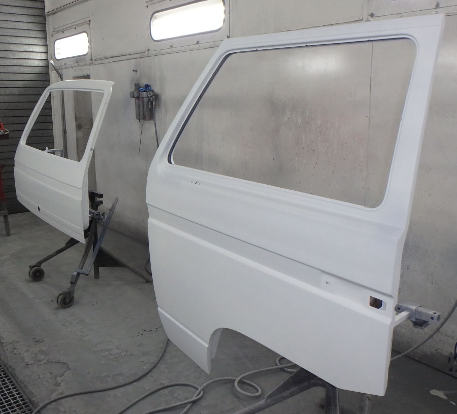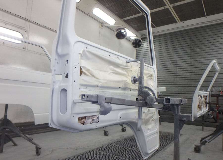 Nun läßt der Besitzer das Fahrzeug bei uns komplett zerlegen, wo nötig schweißen, in Pastellweiß L90D lackieren und wieder zusammenbauen. Dabei werden diverse Teile wie Dichtungsgummis bei Bedarf erneuert.