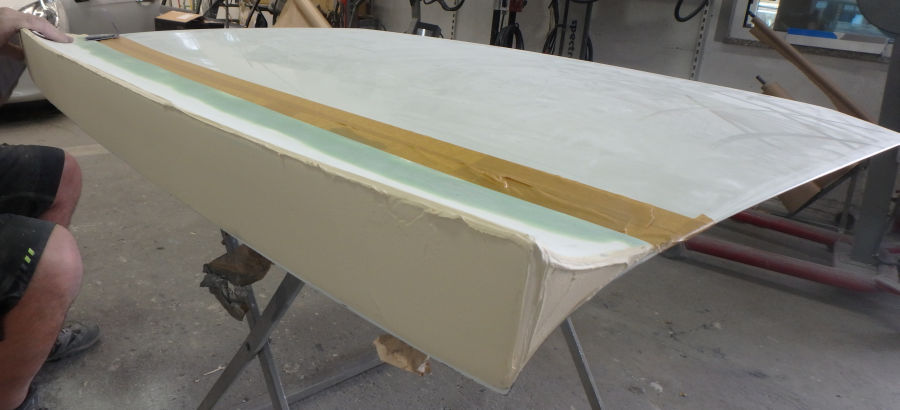 Dann wurde es wegen der Formstabilität noch vor den Schleif- und Spachtelarbeiten auf dem Kofferdeckel verklebt.