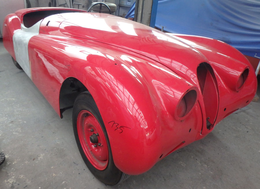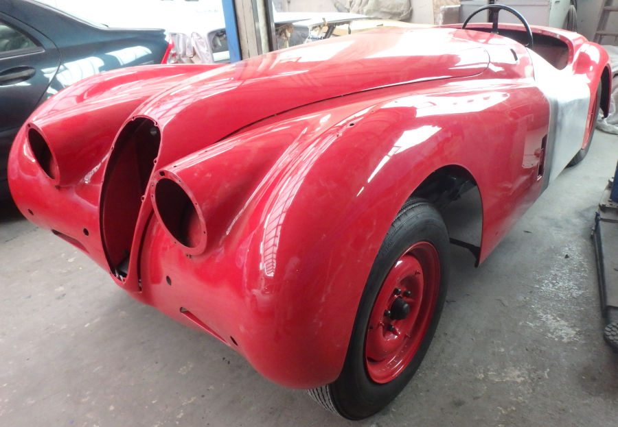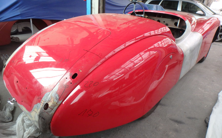 Die Felgen sind hier noch rot, doch sie werden, genauso wie die Radkappen, später auch in der Wagenfarbe lackiert.