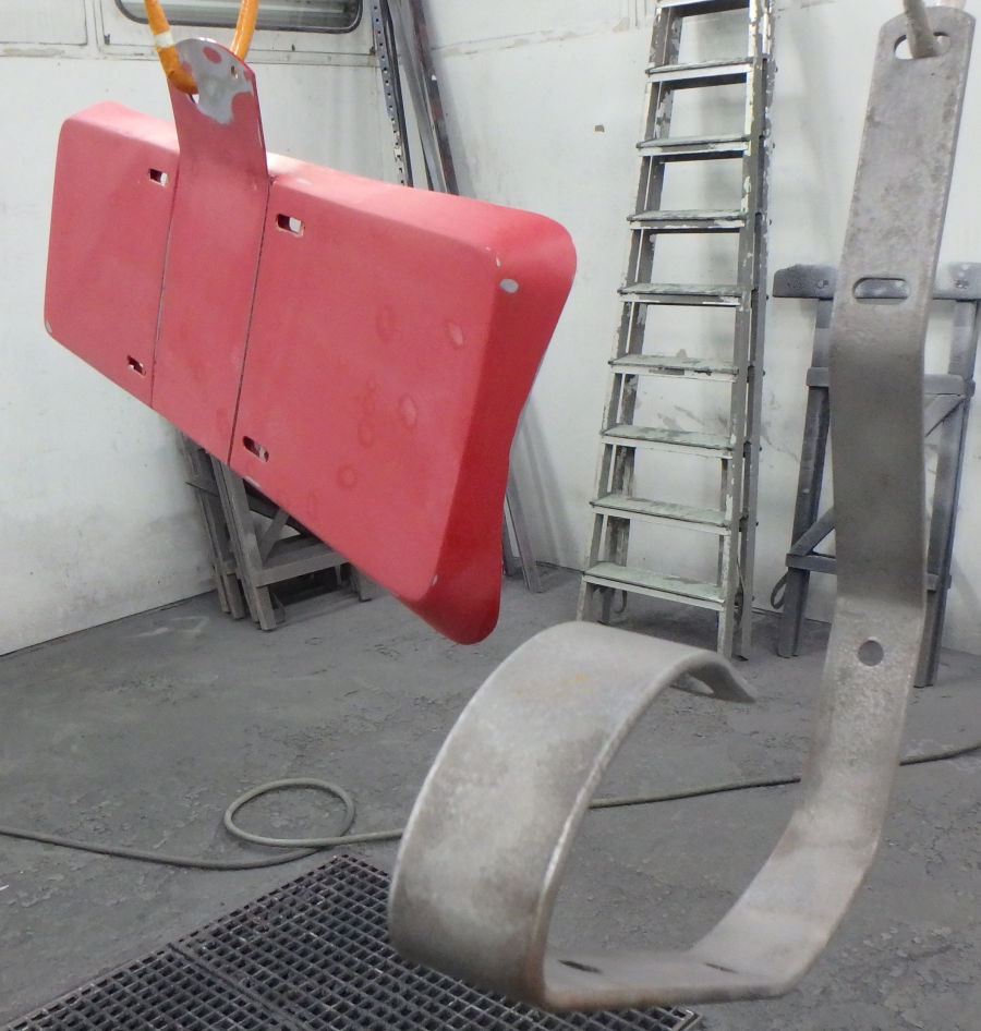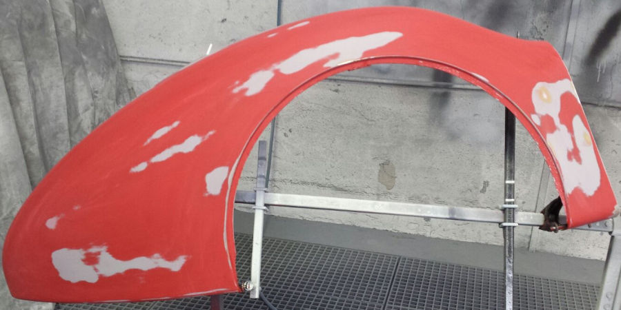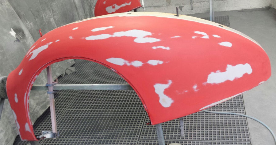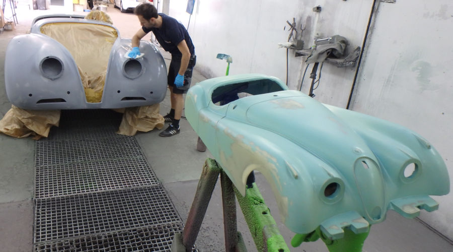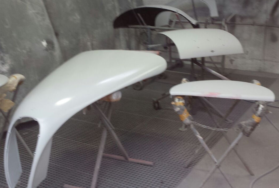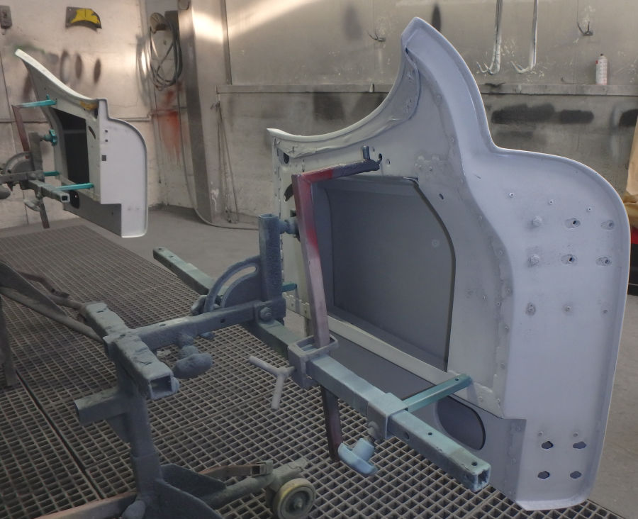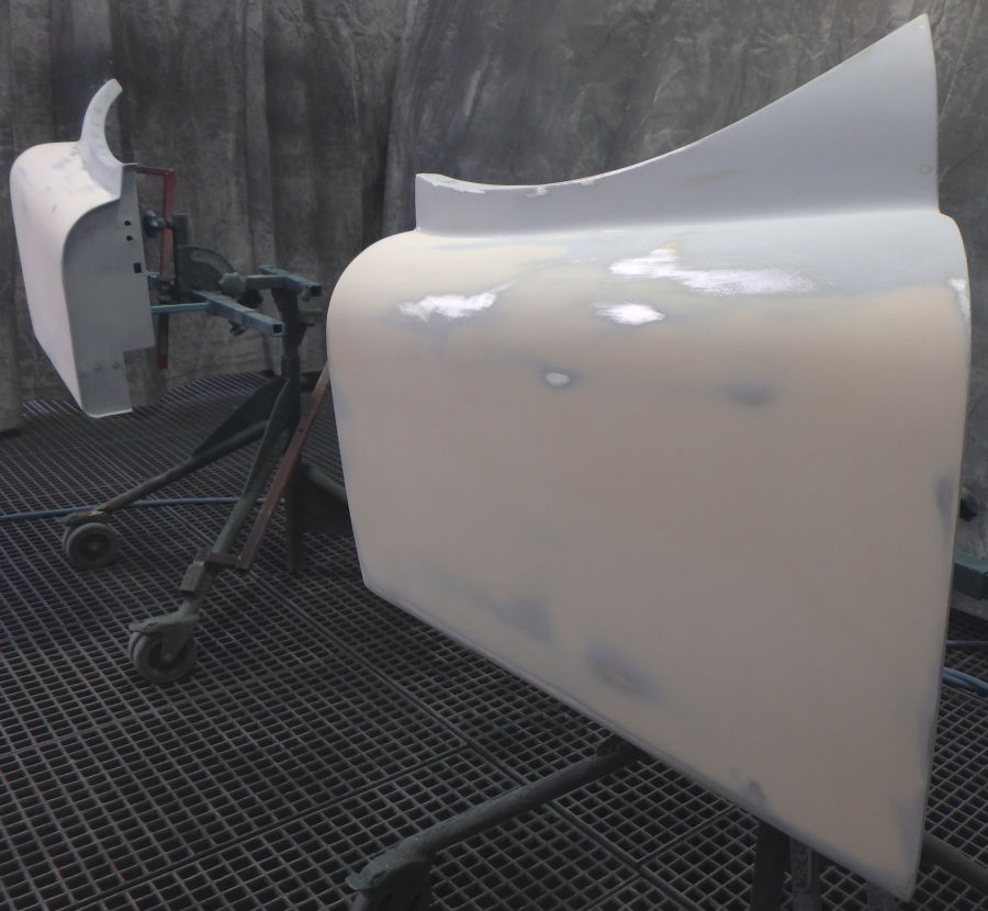 Nach den Schleif- und Spachtelarbeiten die Anbauteile vorbereitet zur Grundierung in der Lackierkabine: