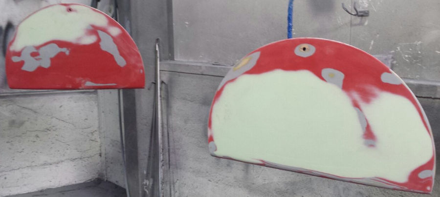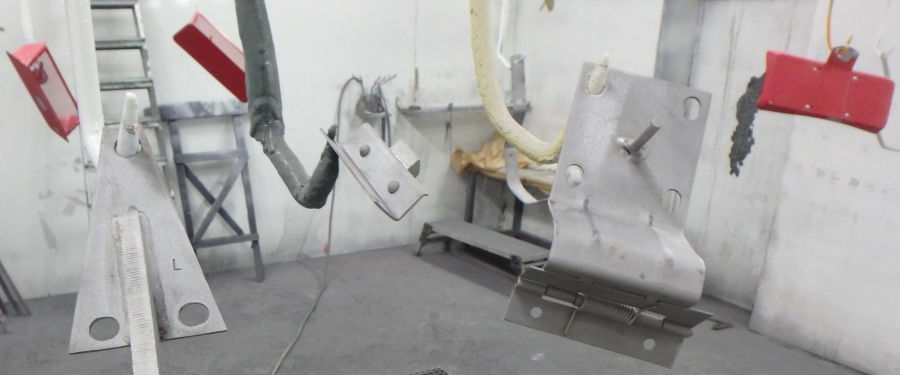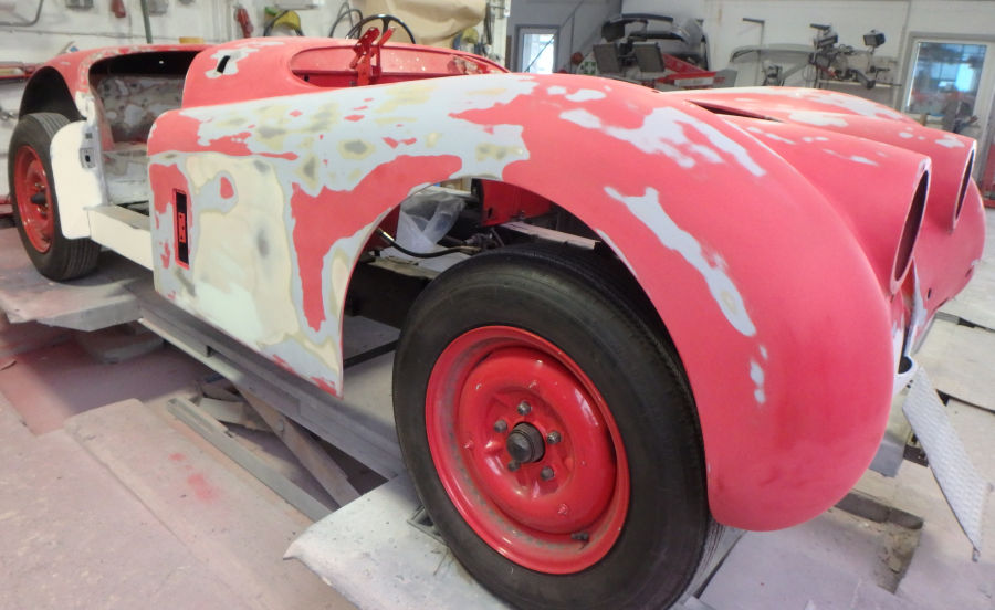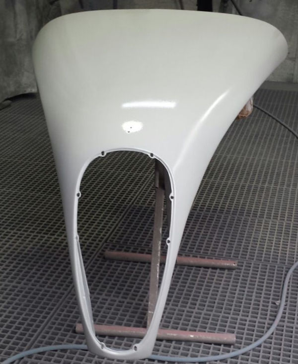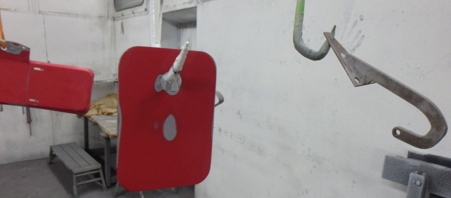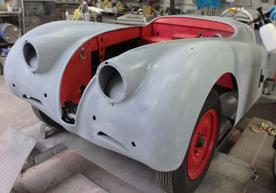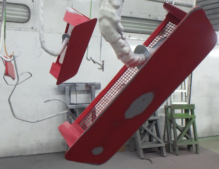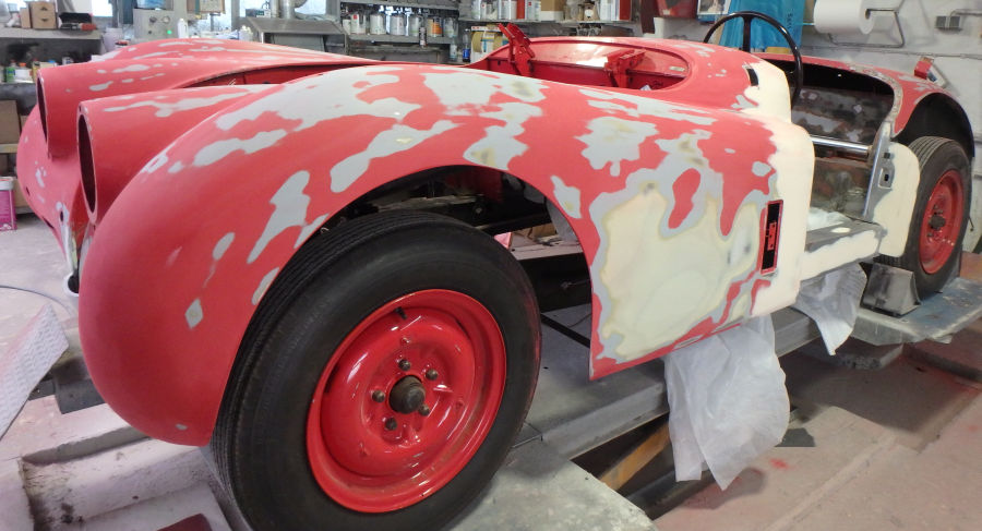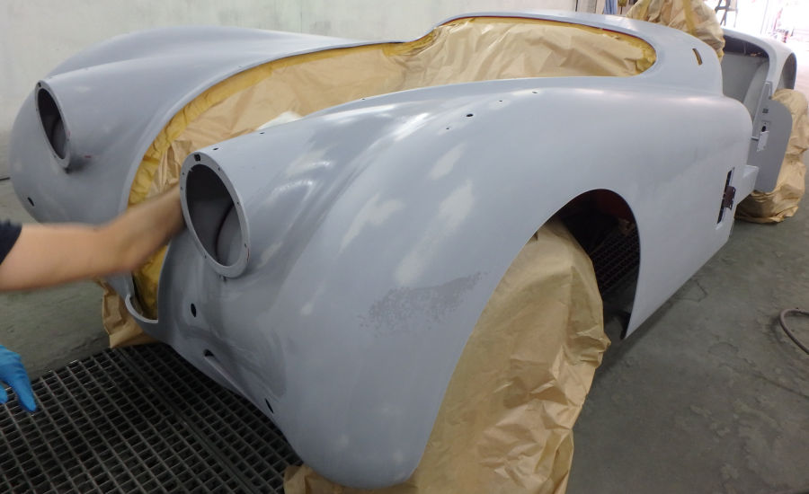 Nach den Schleif- und Spachtelarbeiten die Anbauteile vorbereitet zur Grundierung in der Lackierkabine: