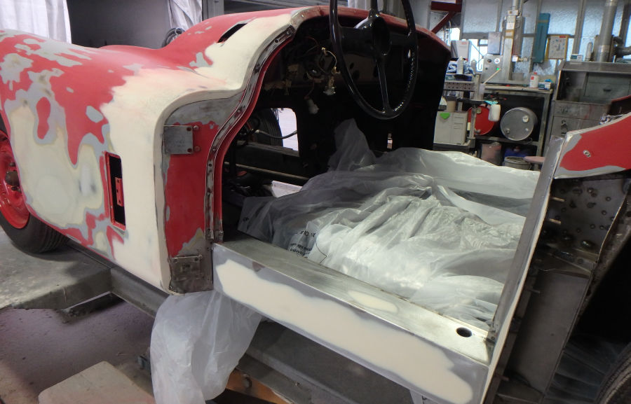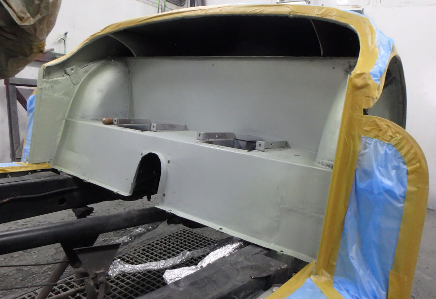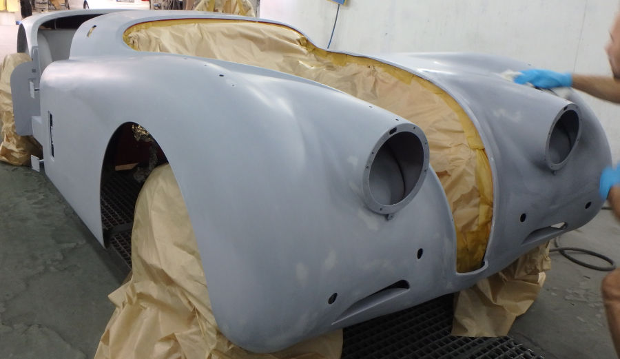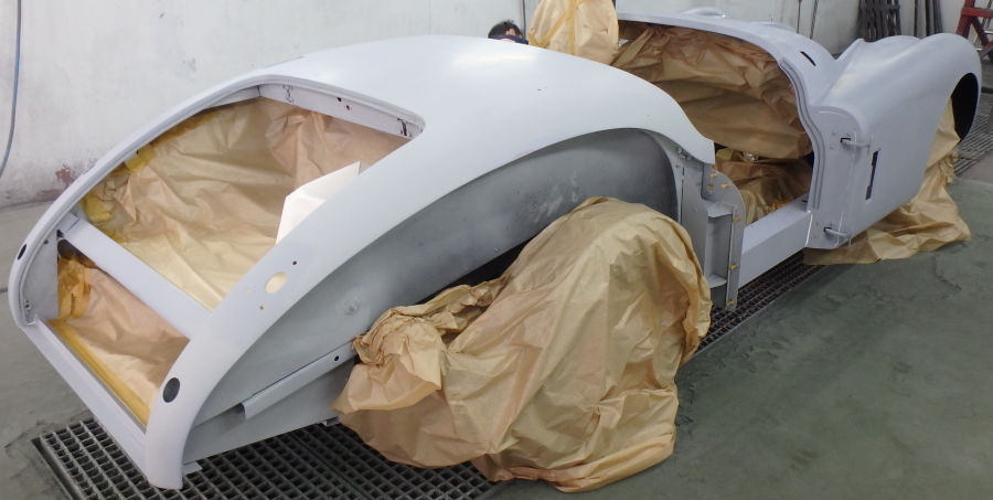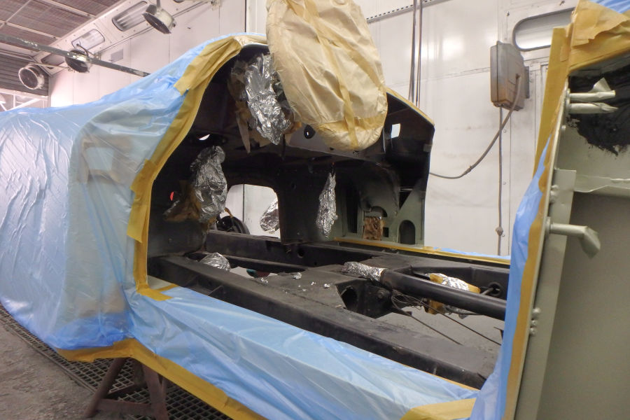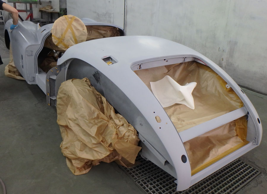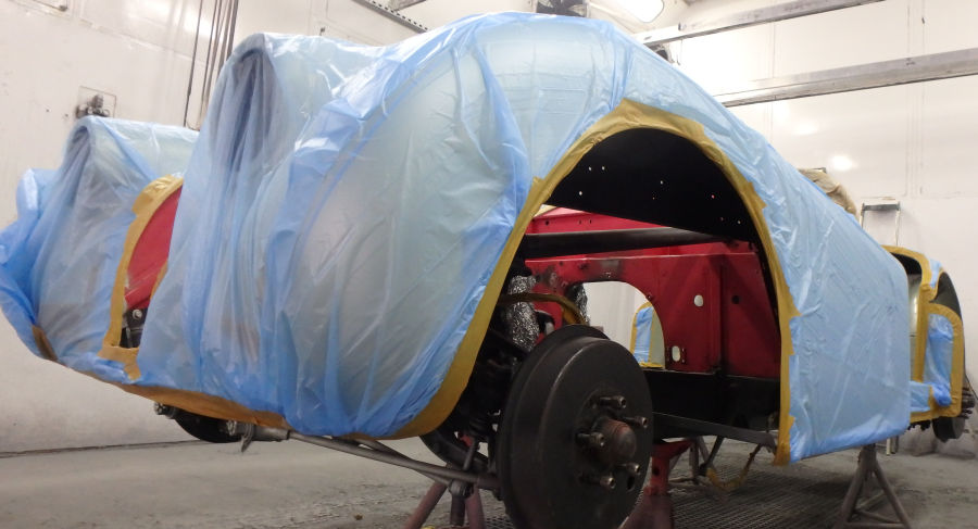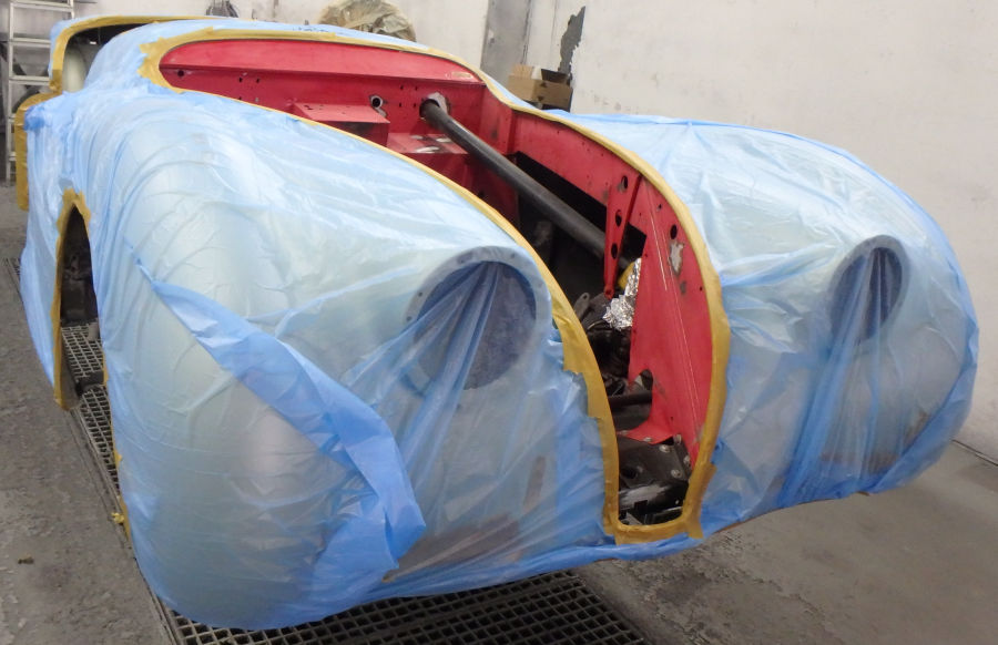 Die Karosserie wird zur Lackierung vorbereitet, abgeklebt und mit Silikonentferner gereinigt: