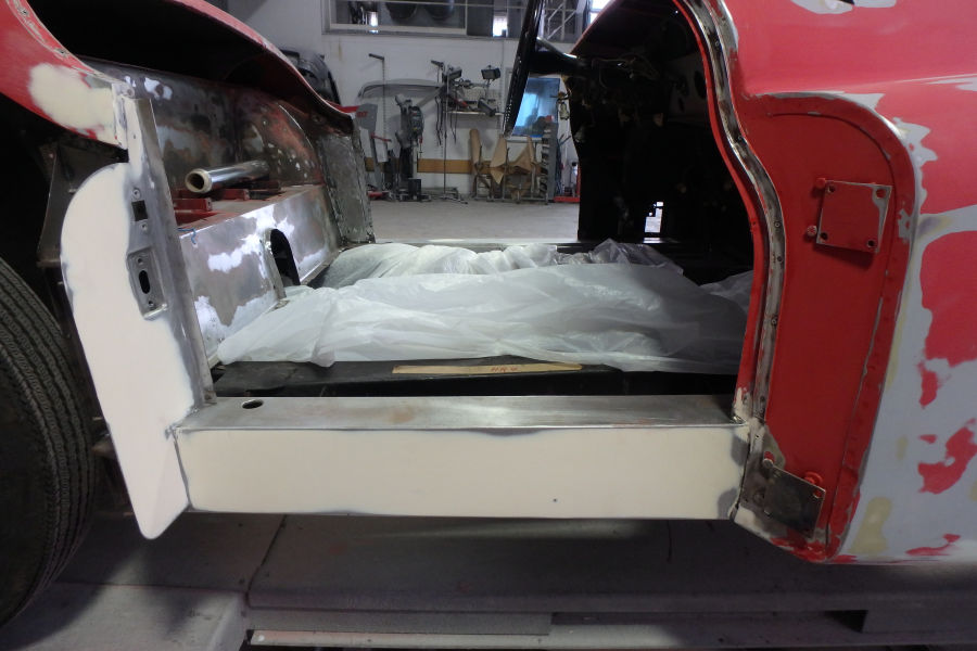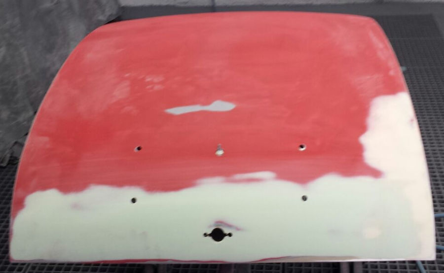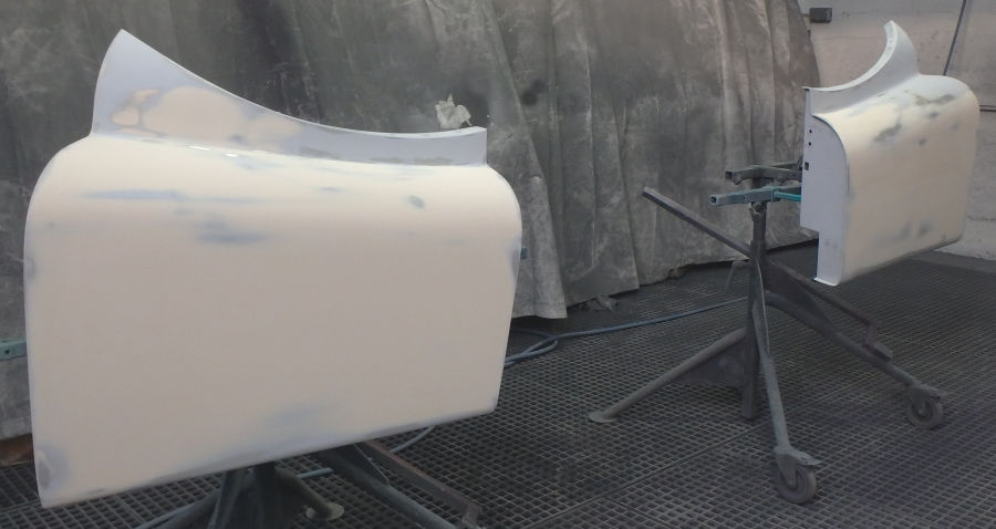 Grundierte Motorhaube, Kotflügel, Kofferdeckel und Karosserie (bereits geschliffen):