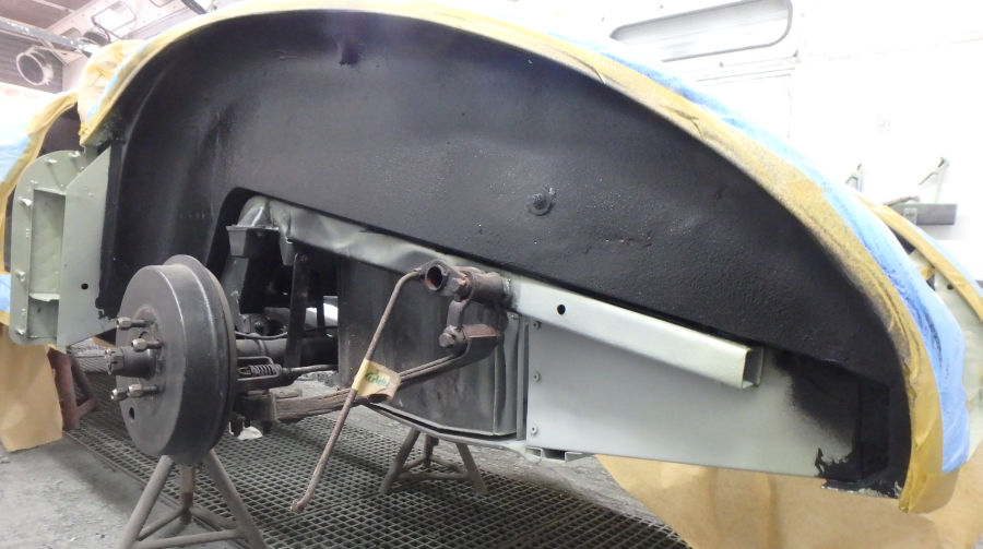 Nun wird umgekehrt abgeklebt und innen / unten lackiert und, wo nötig, auch der Steinschlagschutz nachgearbeitet: