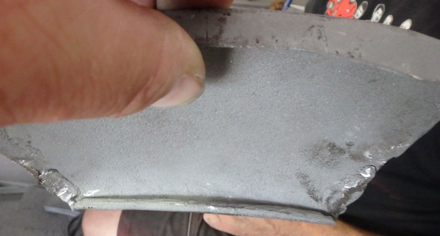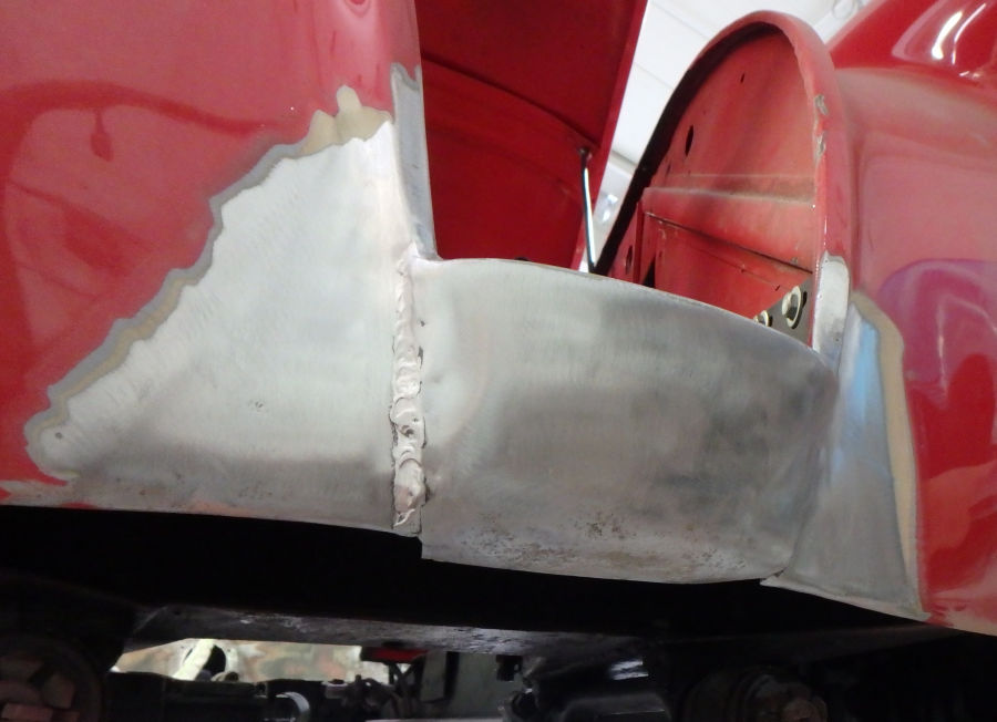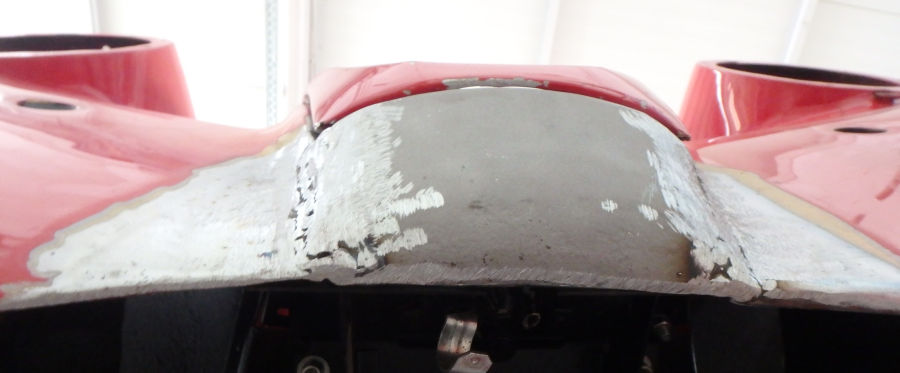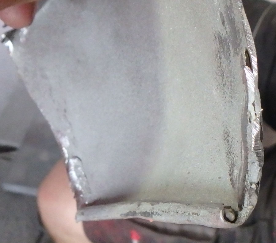 Als der betroffene Bereich vom Lack befreit ist, sind die alten Schweißnähte und das Problem deutlich zu sehen.