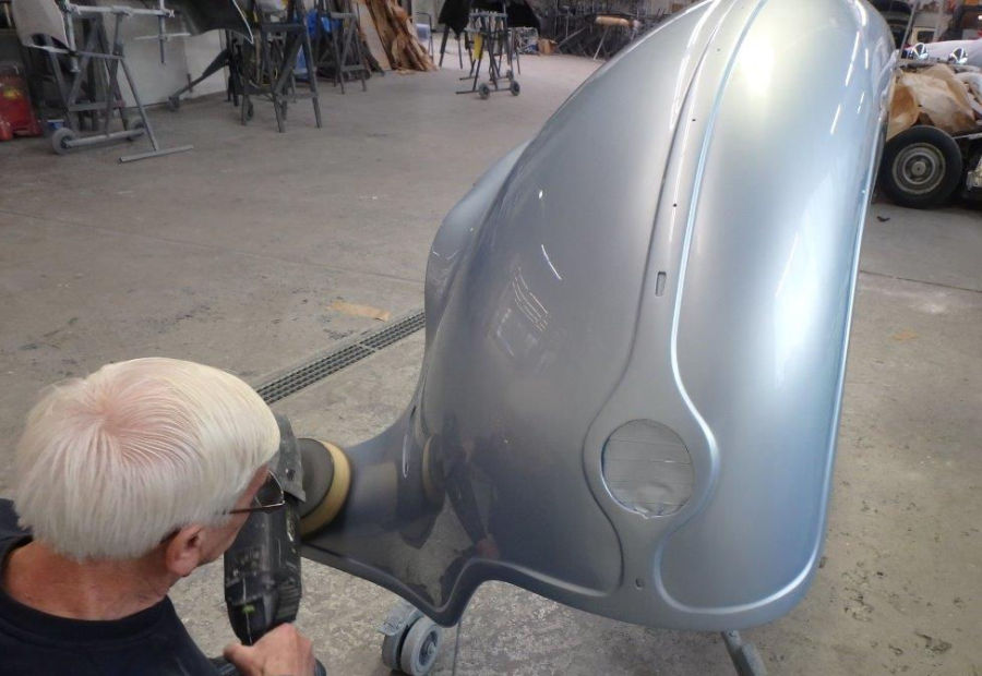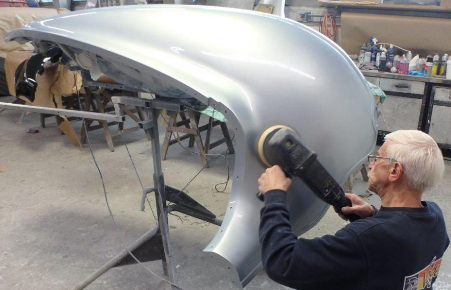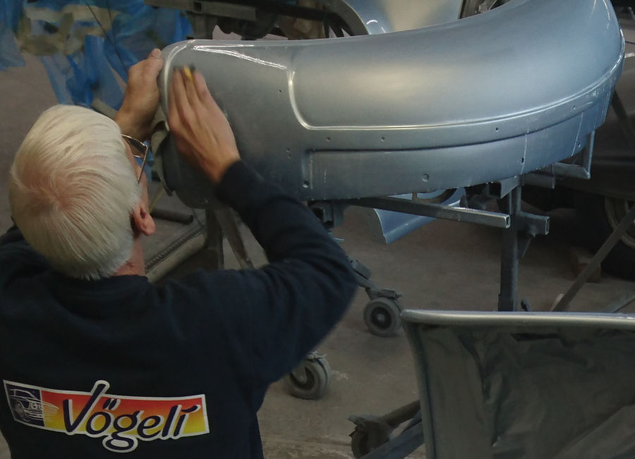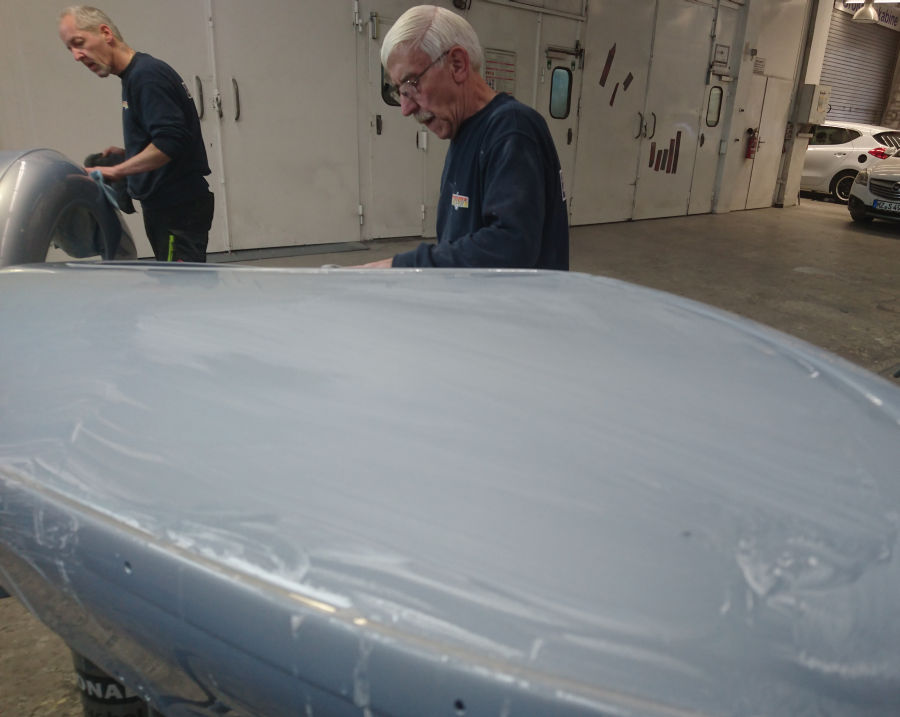 In der Summe wird der Horch in rund 35 Stunden auf Hochglanz gebracht, alleine 4 Stunden schlagen für einen der großen vorderen Kotflügel zu Buche.