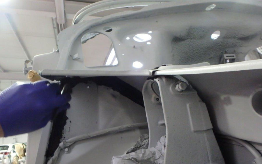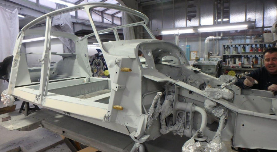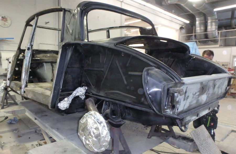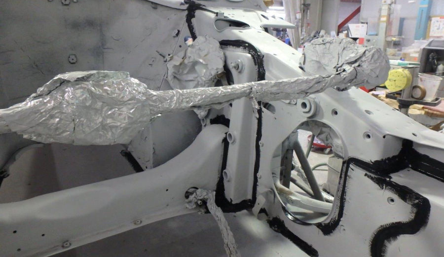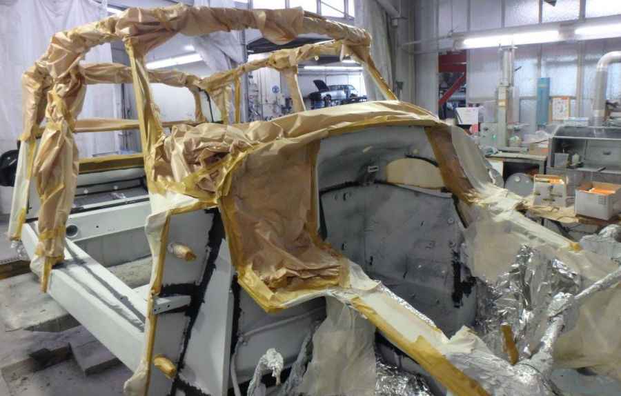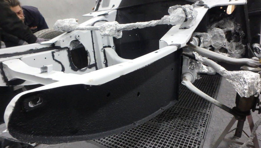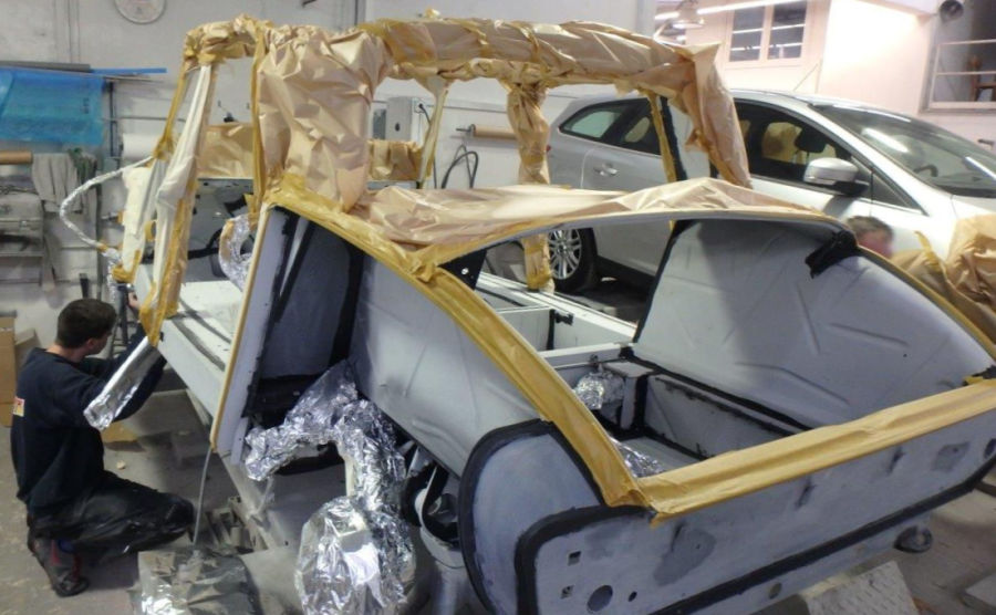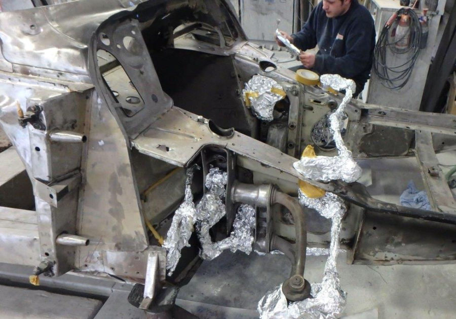 An der Karosse werden alle noch verbauten Leitungen und Anbauteile, die vor der EP-Grundierung geschützt werden müssen, mit Alufolie umwickelt.