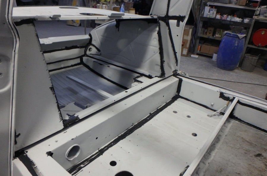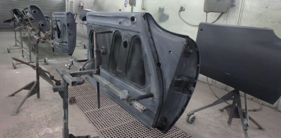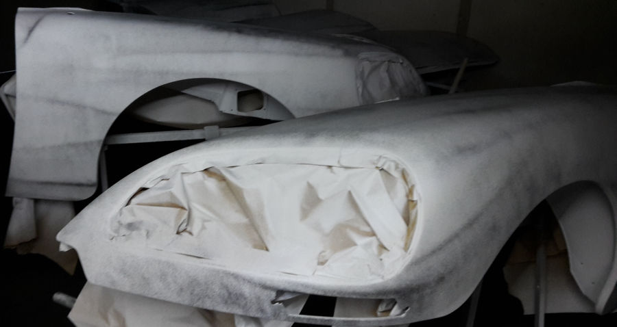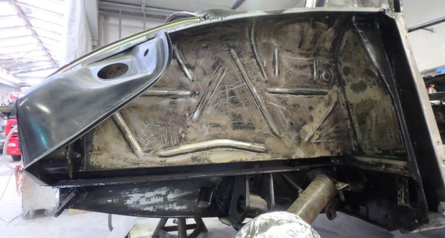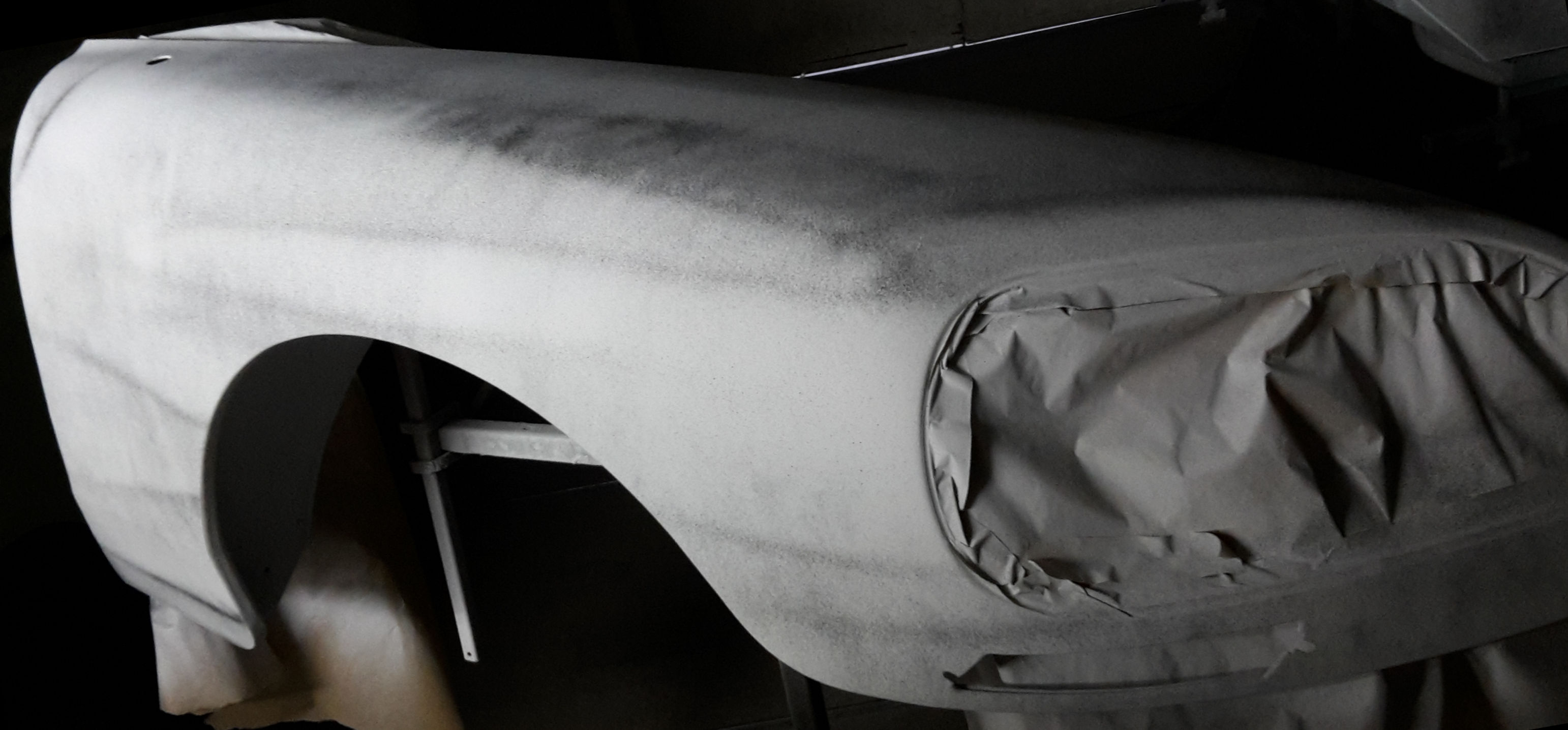 Kofferdeckel und Kotflügel hinten mit aufgetragenem EP-Füller und Kontrastfarbe beim Schleifen: