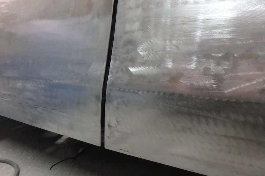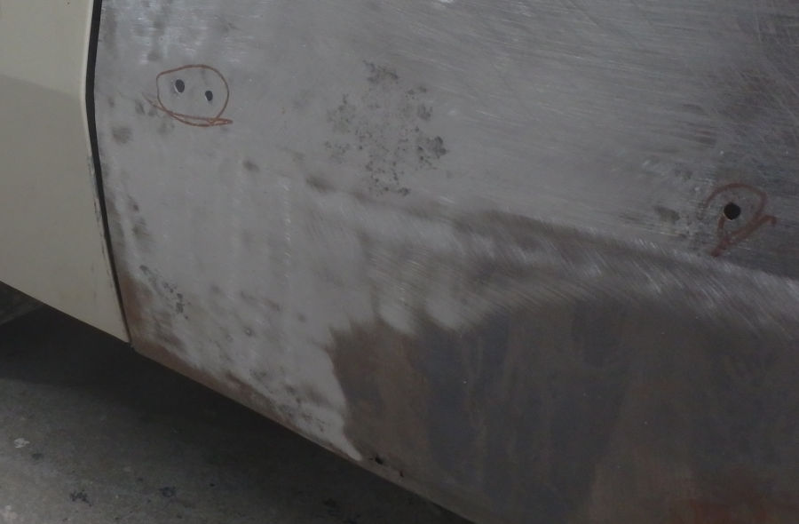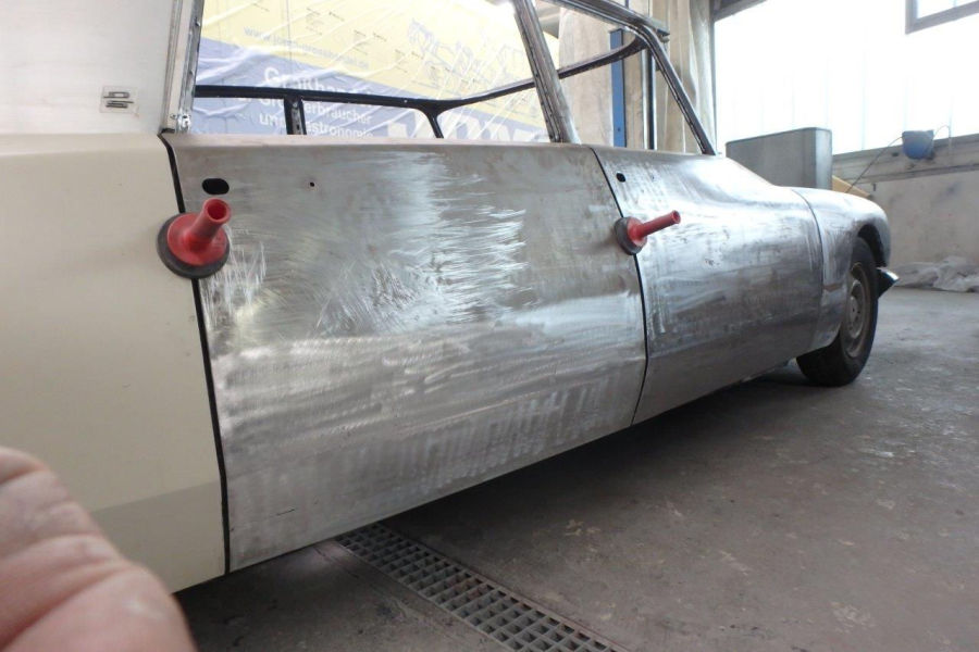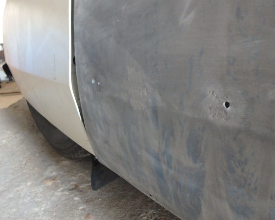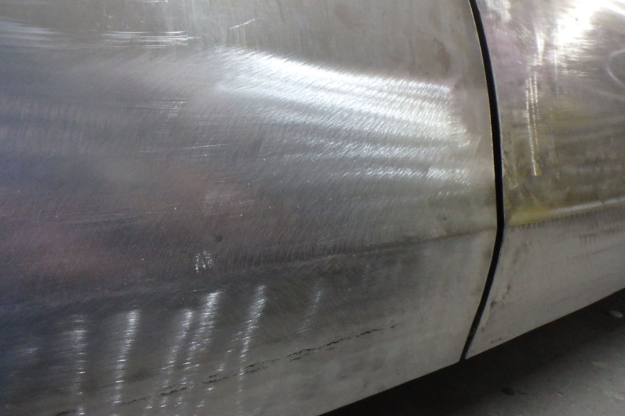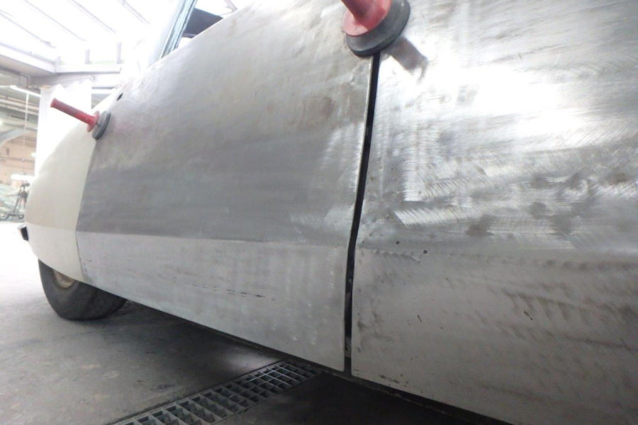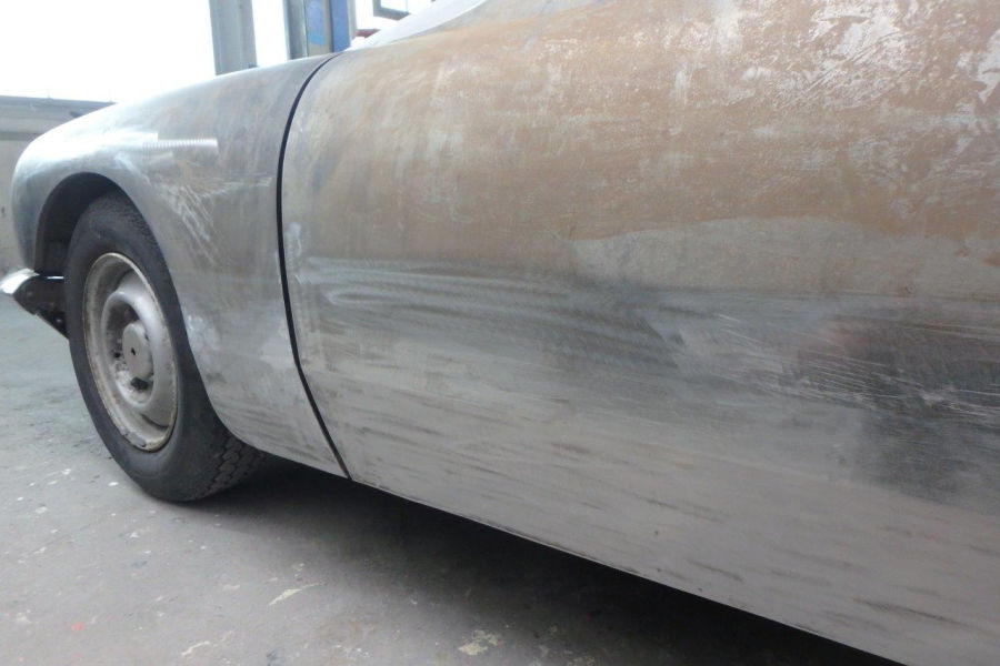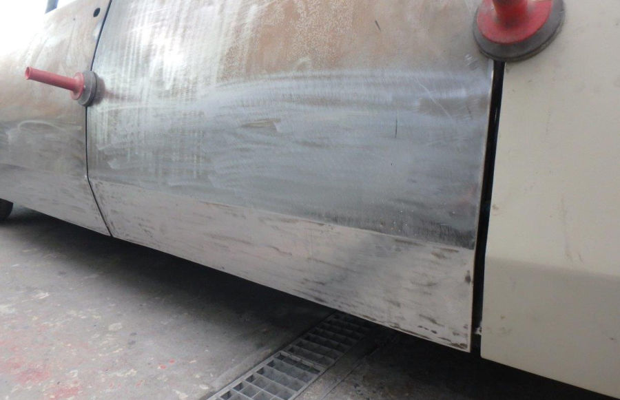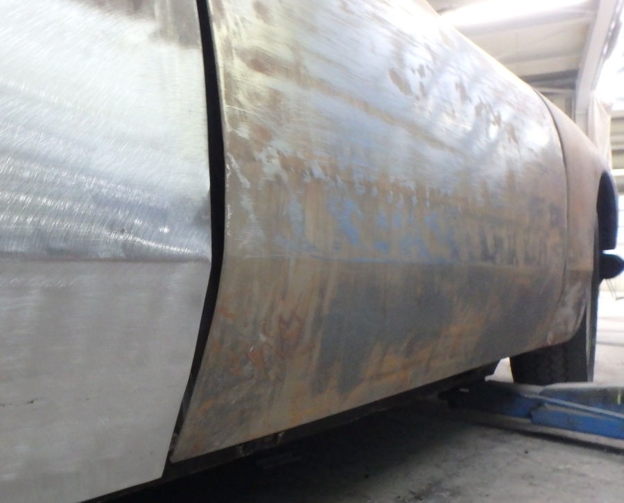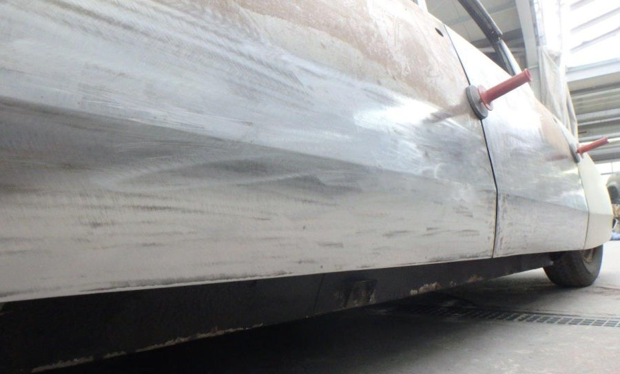 Da die Karosse schon vorgeschliffen angeliefert worden war, sind hier unsererseits nur noch kleinere Schleif- und Spachtelarbeiten nötig - wie z.B. am Schweller (Bild 5).