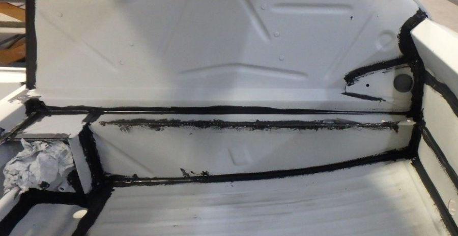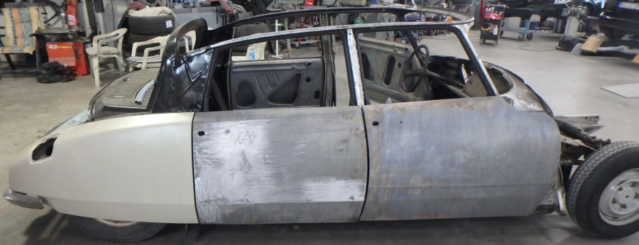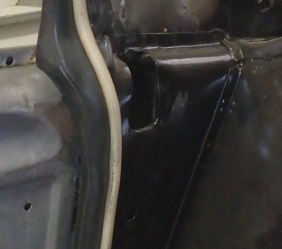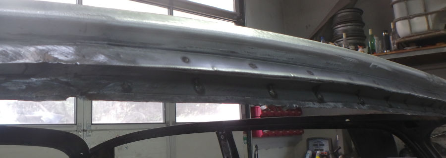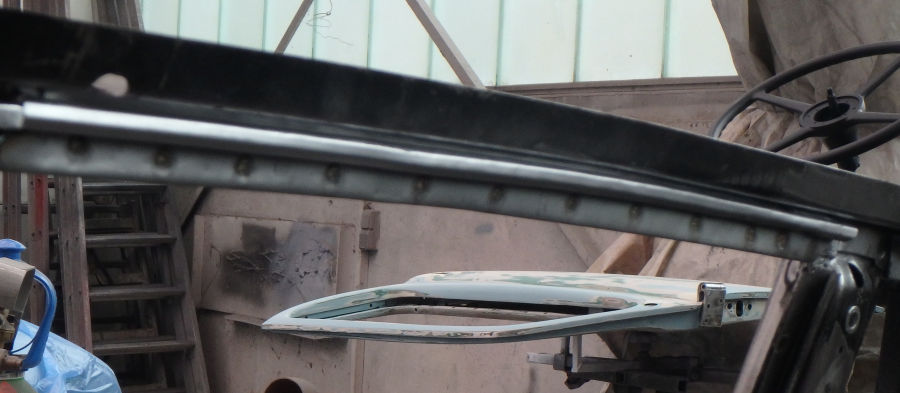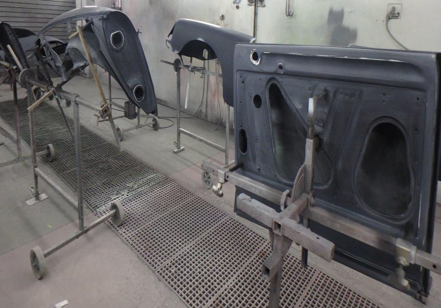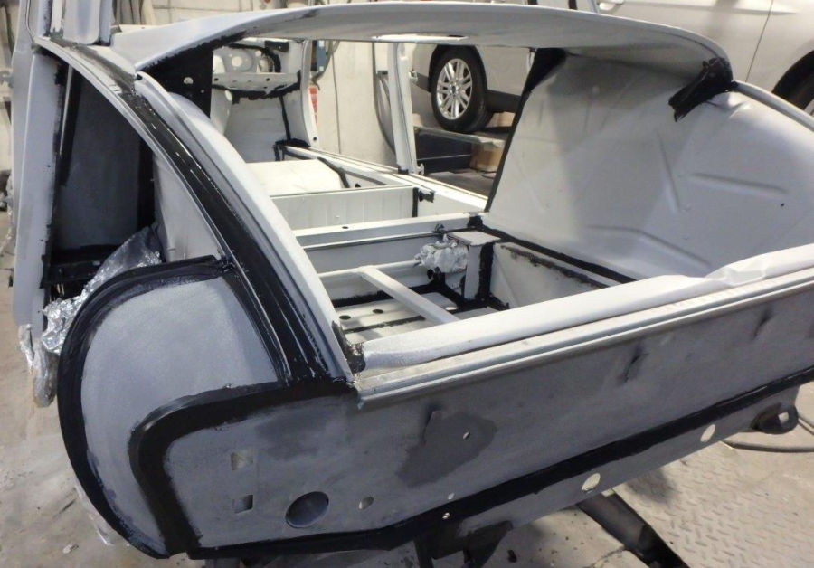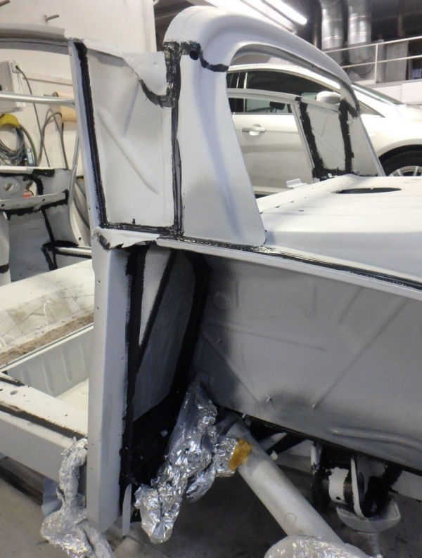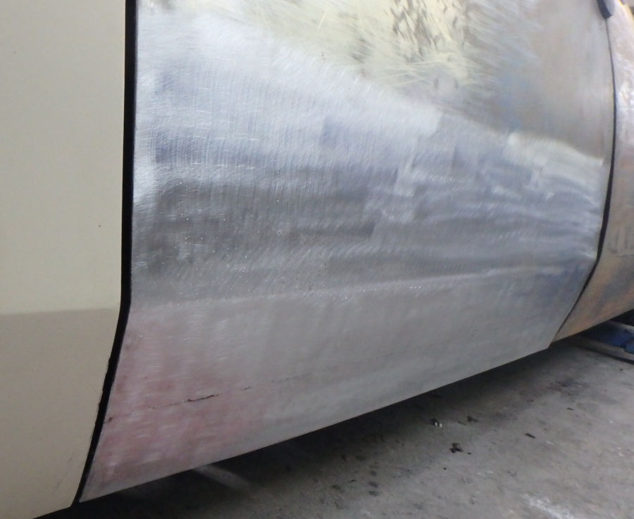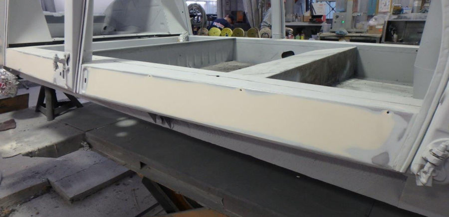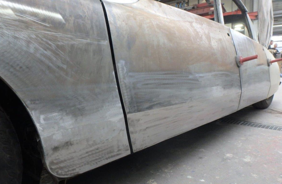 Da die Karosse schon vorgeschliffen angeliefert worden war, sind hier unsererseits nur noch kleinere Schleif- und Spachtelarbeiten nötig - wie z.B. am Schweller (Bild 5).